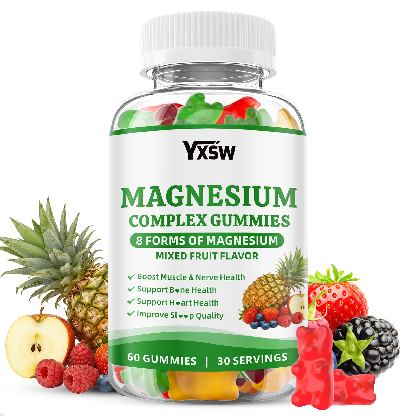 Health: magnesium complex supplements are made with non-GMO, gluten-free, and dairy-free ingredients, contain no artificial additives, fillers, or preservatives, comply with GMP standards, and have passed laboratory testing. Sugar-Free Delicious Gummies: Skip the capsules and pills! Our magnesium complex gummies are a tasty, sugar-free alternative. Designed for ease of use, they fit seamlessly into your daily routine. Boost Your Wellness: Our unique formula combines multiple forms of magnesium for enhanced bioavailability. With our Magnesium Complex, you can get overall health support. Each gummy supports wellness and vitality, promoting energy production and muscle support, ensuring a smoother and more efficient operational flow within your body. B?ne Muscle Support: Magnesium is essential for supporting healthy muscles and other bodily functions. Our Magnesium Complex goes beyond just maintenance. It supports healthy muscles, reduces cramps, and promotes quicker recovery after physical activity. Additionally, it helps support b?ne density, providing your skeletal system with the protection it needs against age-related wear and potential injuries. Multi-Source Magnesium Blend: Our magnesium complex gummies are formulated with 8 unique forms of elemental magnesium and ensure maximum absorption. Every form, from Magnesium Oxide to Magnesium glycinate, brings its unique advantage to the table, ensuring that your body benefits from the full spectrum of magnesium's benefits. Embrace the power of diversity with our YXSW Magnesium Complex.