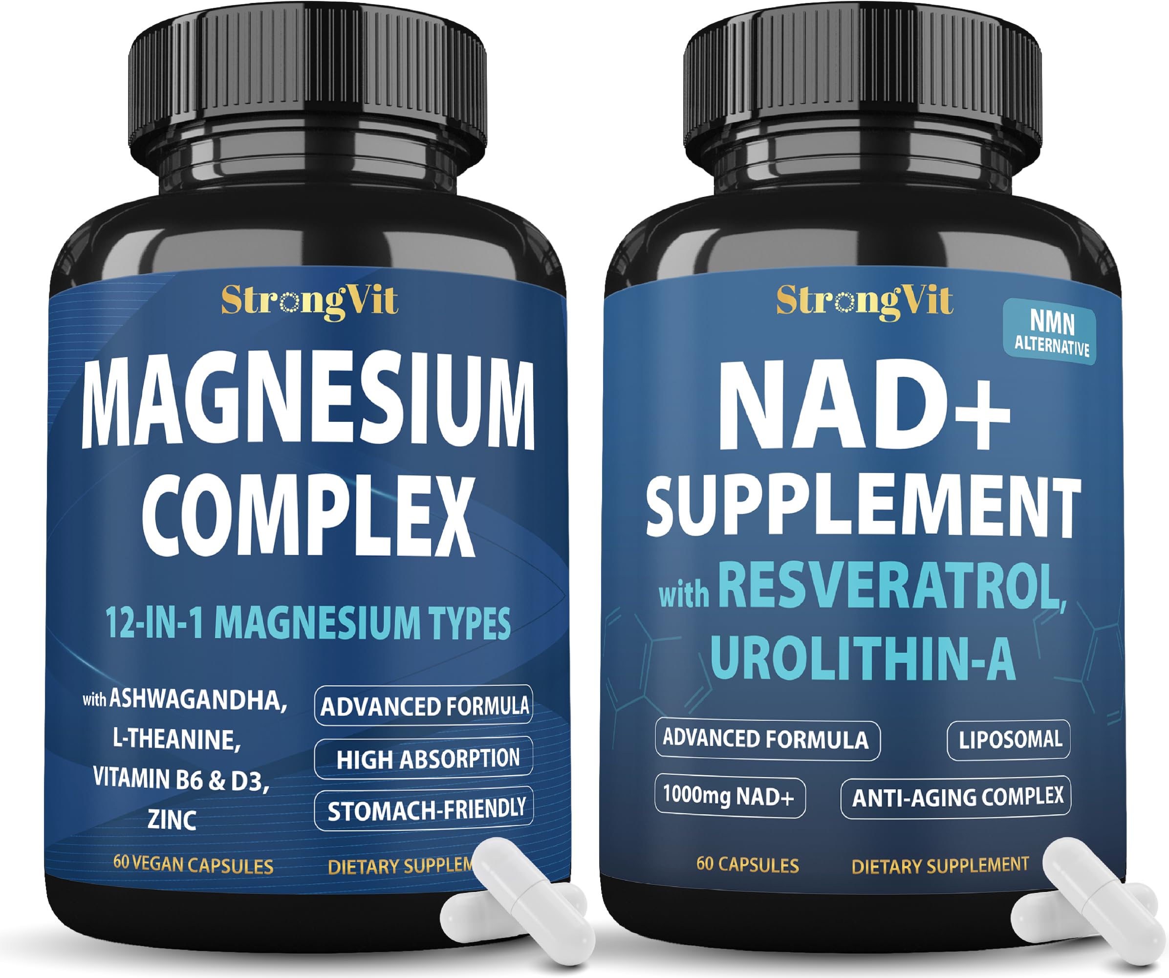 At StrongVit, your satisfaction is our top priority. Moreover, we stand behind our products with a 100 money-back. If you're not delighted, rest assured you're fully covered by our no-questions-asked money-back. Just contact us through . Quality Assurance: Manufactured in a GMP-certified facility and third-party Lab tested in the USA, StrongVit's Capsules prioritize quality and safety, ensuring you receive a premium product. Convenient Serving: Each bottle provides a 30-day supply of easy-to-swallow capsules, offering a convenient way to incorporate this powerful blend of superfoods into your daily routine. Dietary Considerations: These vegan-friendly capsules are gluten-free, non-GMO, and free from sugar, gelatin, artificial flavors, colors, sweeteners, and preservatives, making them suitable for various diets, including keto, vegan and vegetarian. Strong Formulation: StrongVit's Magnesium Complex containing 12 elemental of magnesium, adding the NAD Complex, make this bundle a complete product. It include Magnesium, Ashwagandha, L-Theanine, Zinc, NAD, Resveratrol and more.