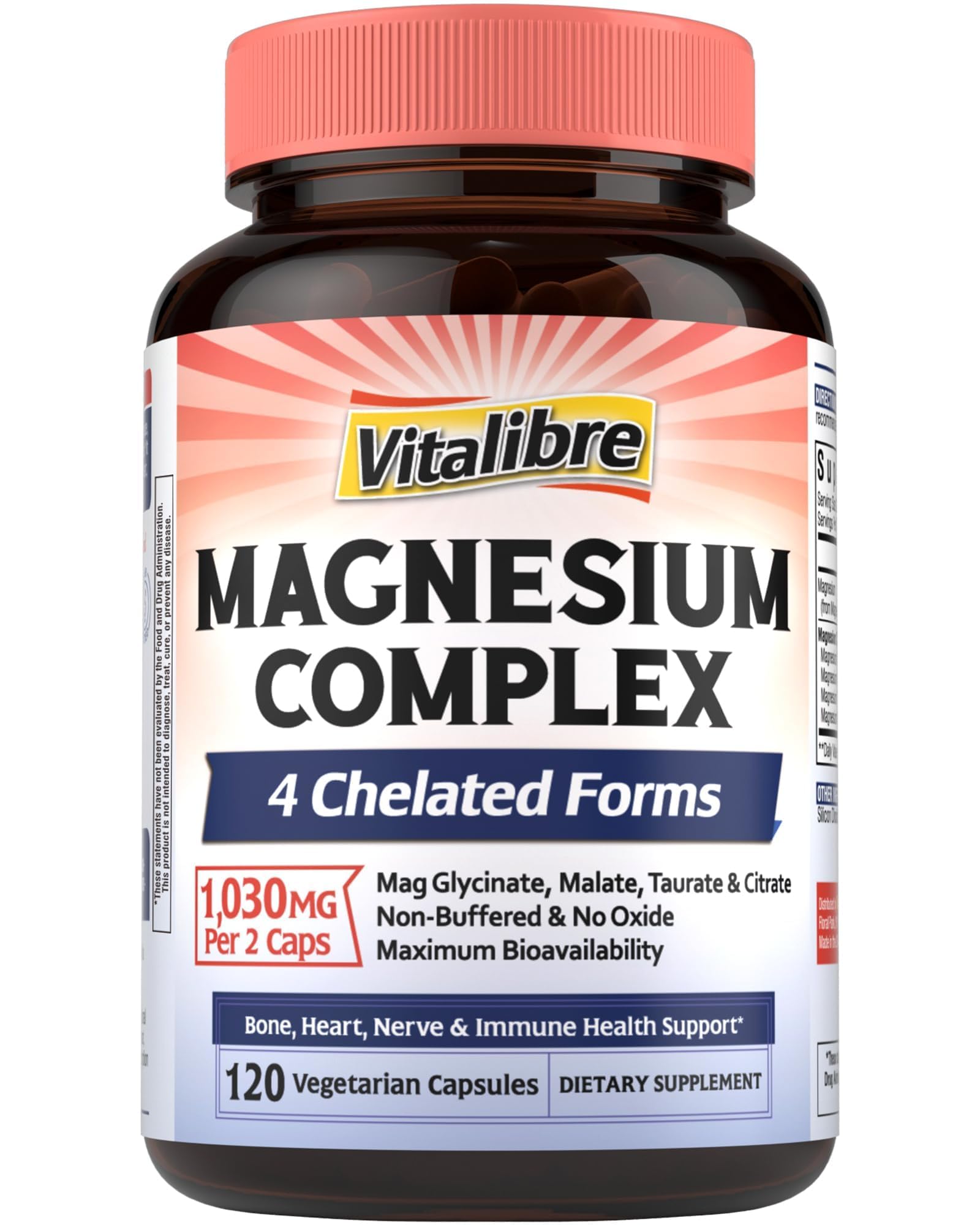 High Quality And Value: From meticulously sourcing the finest, most bioavailable ingredients to rigorously testing each formula, the team behind Vitalibre is driven by a relentless pursuit of purity and potency. Putting aside unnecessary fillers and artificial ingredients, we're committed to transparency in labeling and providing clear information contains zero sugar, gluten, dairy, soy, wheat, eggs, tree nuts peanuts. Made With You In Mind: Combining nature's nutrients with carefully-crafted formulas, we create our first line of clean supplements to help you make confident choices for your health. We are proud to affirm all Vitalibre products are manufactured in the U.S in facilities that adhere to strict Good Manufacturing Practices (GMP) guidelines. 1030mg Magnesium Compound (No Oxide): Research shows about 75 of Americans can't get enough magnesium from daily diets. Each serving of Vitalibre Magnesium Complex contains 140mg of elemental magnesium from 1030mg of magnesium compound to help bridge the nutritional gap caused by an unbalanced diet. . Bone, Heart Nerve Health Support : Magnesium is essential for hundreds of enzymatic reactions in your body. Our synergistic blend is crafted to support nerve relaxation, boost healthy energy levels, fortify bone and heart function, and promote a healthy stress response without causing drowsiness. . 1030mg Magnesium Compound (No Oxide): Research shows about 75 of Americans can't get enough magnesium from daily diets. Each serving of Vitalibre Magnesium Complex contains 140mg of elemental magnesium from 1030mg of magnesium compound to help bridge the nutritional gap caused by an unbalanced diet. .