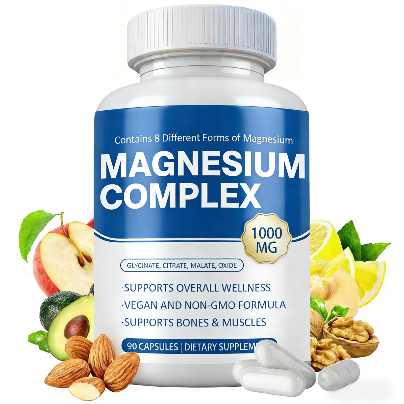 Magnesium Complex Supplement 8 Elemental 1000mg - Magnesium Glycinate Citrate Malate Oxide | Easy Absorption for Bones Muscle Energy Vegan Non-GMO 90 Capsules (1pc)