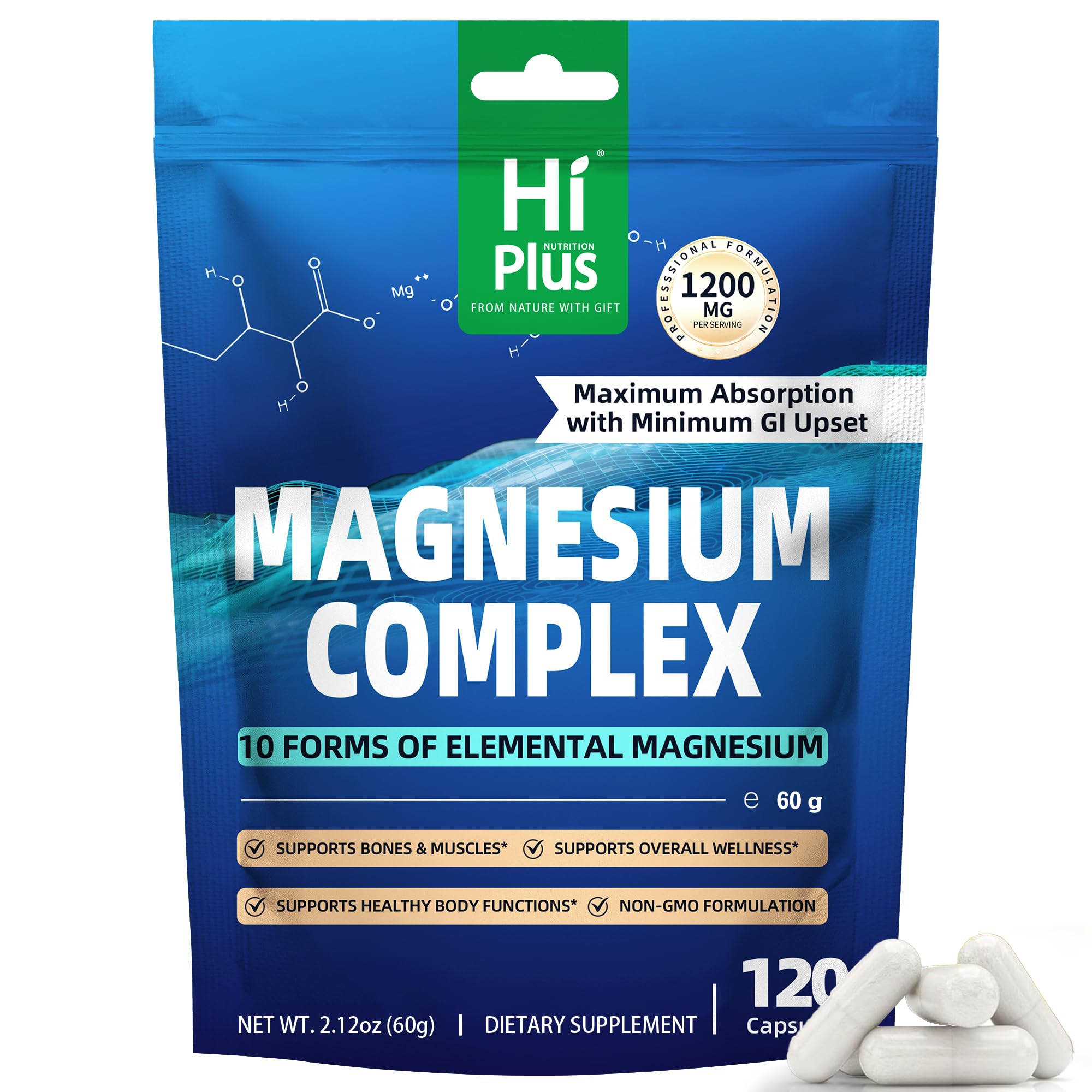 Designed for Everyday Wellness Routines Formulated for men and women, this magnesium complex supplement provides an easy-to-follow daily addition to balanced nutrition, active lifestyles, and general wellness routines. Clean, Vegan Non-GMO Formula Formulated with non-GMO ingredients and vegan capsules, this magnesium supplement provides a clean and simple option without artificial colors or unnecessary additives. Absorption-Focused Multi-Source Formula Formulated with a blend of multiple magnesium sources, this magnesium complex is designed to support efficient absorption and digestive tolerance for everyday use. High-Potency Daily Magnesium Formulated to deliver 1200 mg of elemental magnesium per serving, this magnesium supplement provides a convenient way to maintain consistent daily magnesium intake without combining multiple products. Main Ingredients What's Inside Formulated with 10 forms of elemental magnesium, including magnesium glycinate, citrate, malate and taurate, this magnesium complex supplement provides essential minerals commonly used for daily nutritional support and overall wellness.