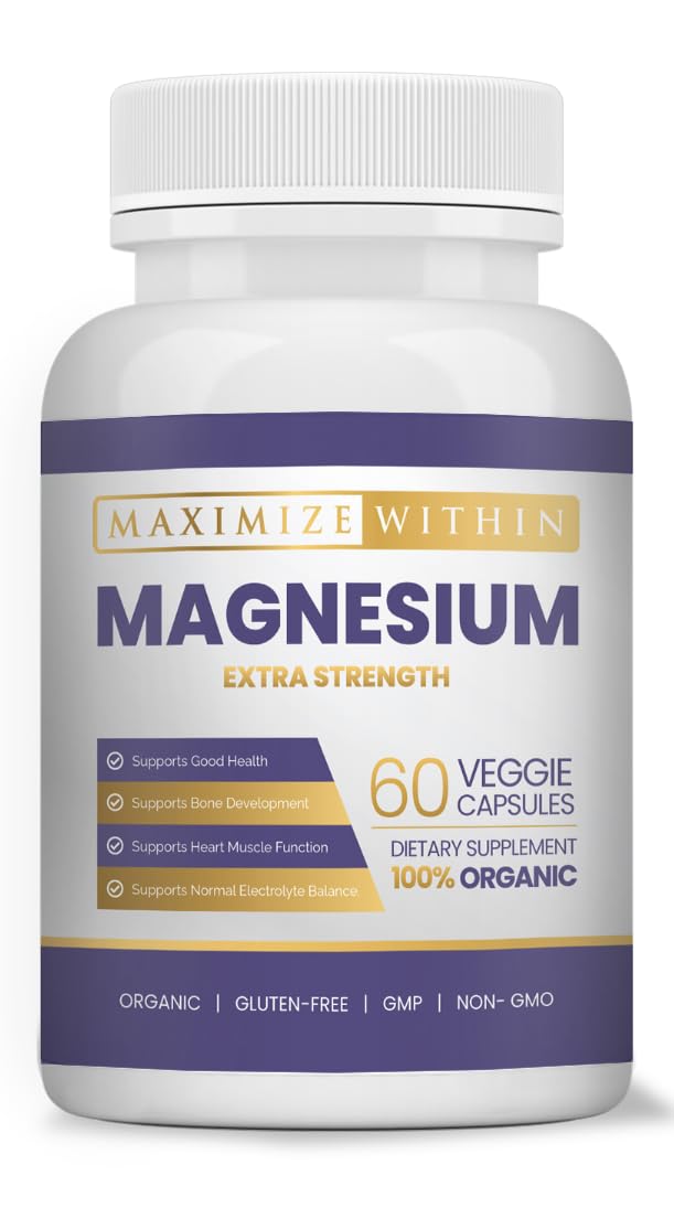 Support Overall Wellness: In addition to bone and muscle support, magnesium plays a role in energy production, stress management, and overall health. Proudly Manufactured in the USA. Vegetarian Formula: Made with only plant-based ingredients for a clean supplement without animal products or byproducts. High Absorption: Formulated with magnesium glycinate for optimal absorption and bioavailability compared to other magnesium compounds. Essential Mineral: Maximize Within Magnesium supplement provides 60 capsules containing 600mg of magnesium per serving to support bone health and muscle function.