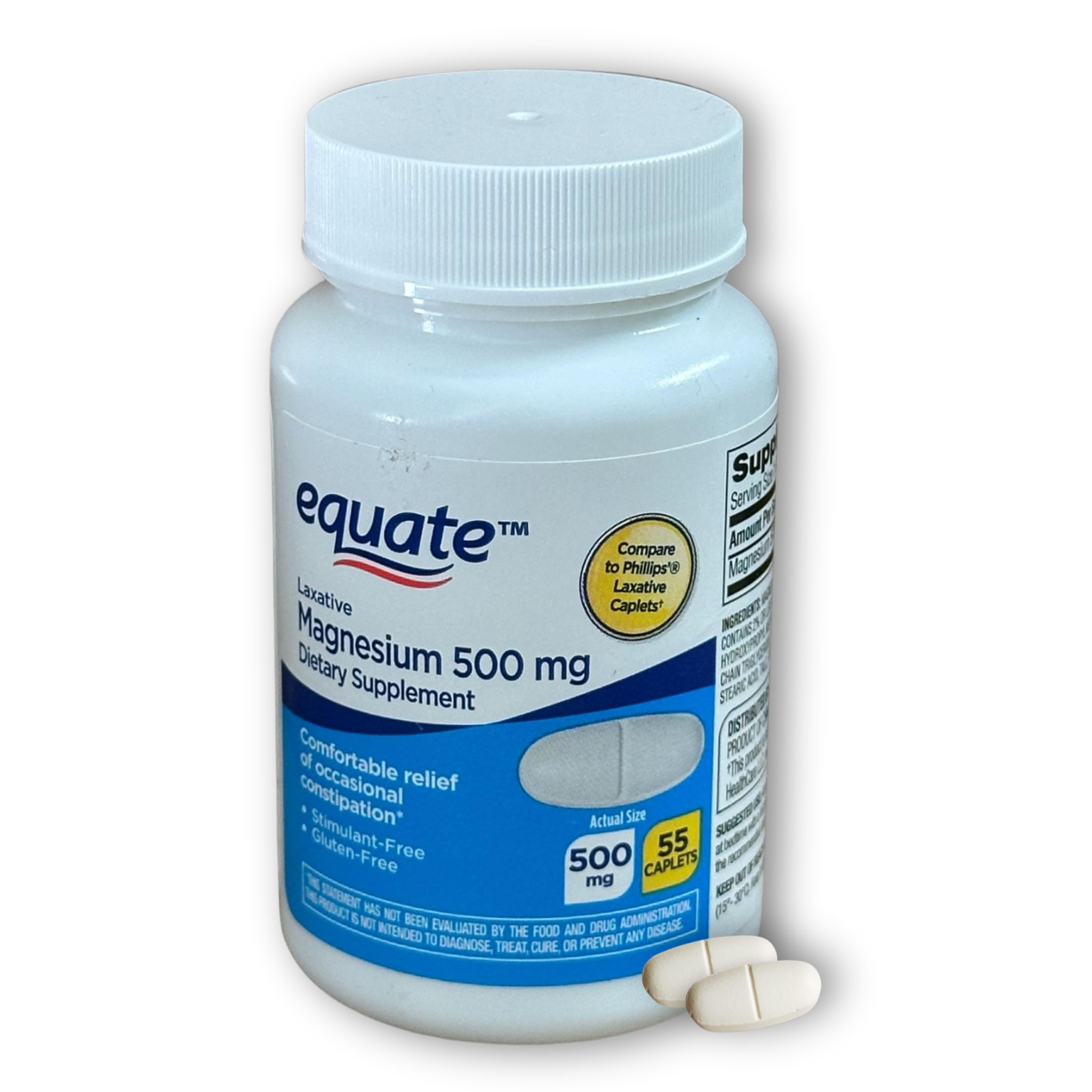 Vegetarian and Gluten-Free: Our caplets are vegetarian-friendly and free from gluten, synthetic dyes, and artificial flavors. Stimulant-Free Formula: Enjoy a natural and stimulant-free solution for constipation relief, suitable for daily use. High-Quality Magnesium Supplement: Each caplet contains 500 mg of magnesium, a key nutrient for promoting regular bowel movements. Effective Constipation Relief: Equate Magnesium Laxative Caplets provide gentle and effective relief from occasional constipation.