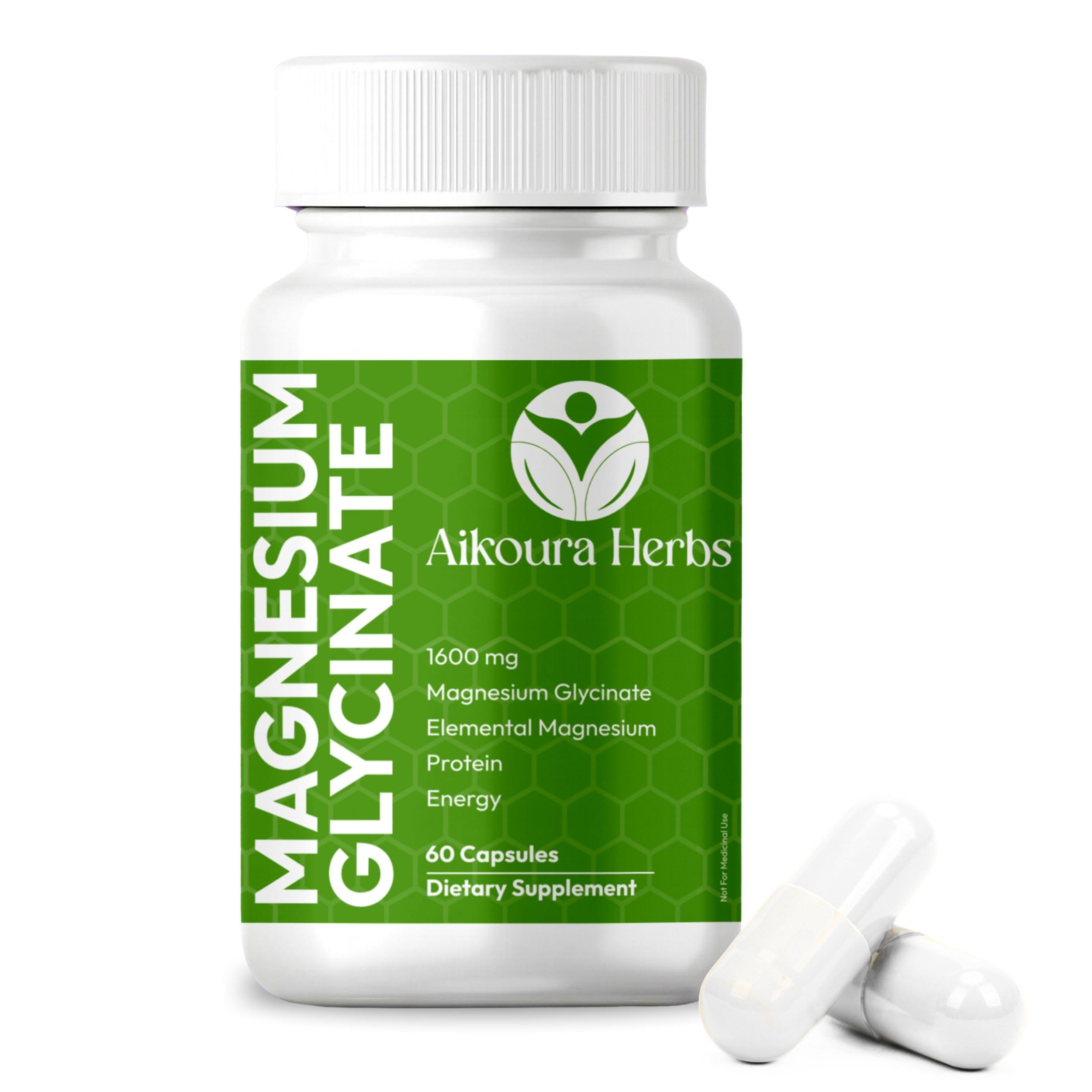 Our vegan AIKOURA HERBS dietary supplements are free of any harmful ingredients like gluten, GMO, dairy, soy, wheat, or any artificial flavor. As a dietary supplement take 2 capsule daily. For best result take with food or as directed by your healthcare professional. Promotes replenishment of natural magnesium mineral levels over time, aids over 300 beneficial bodily functions in both men and women. Our formula contains a potent dose of 1600mg Magnesium Glycinate and 1 Serving is all thats needed for the day. Magnesium Glycinate is a form of Magnesium your body can absorb and use effectively.