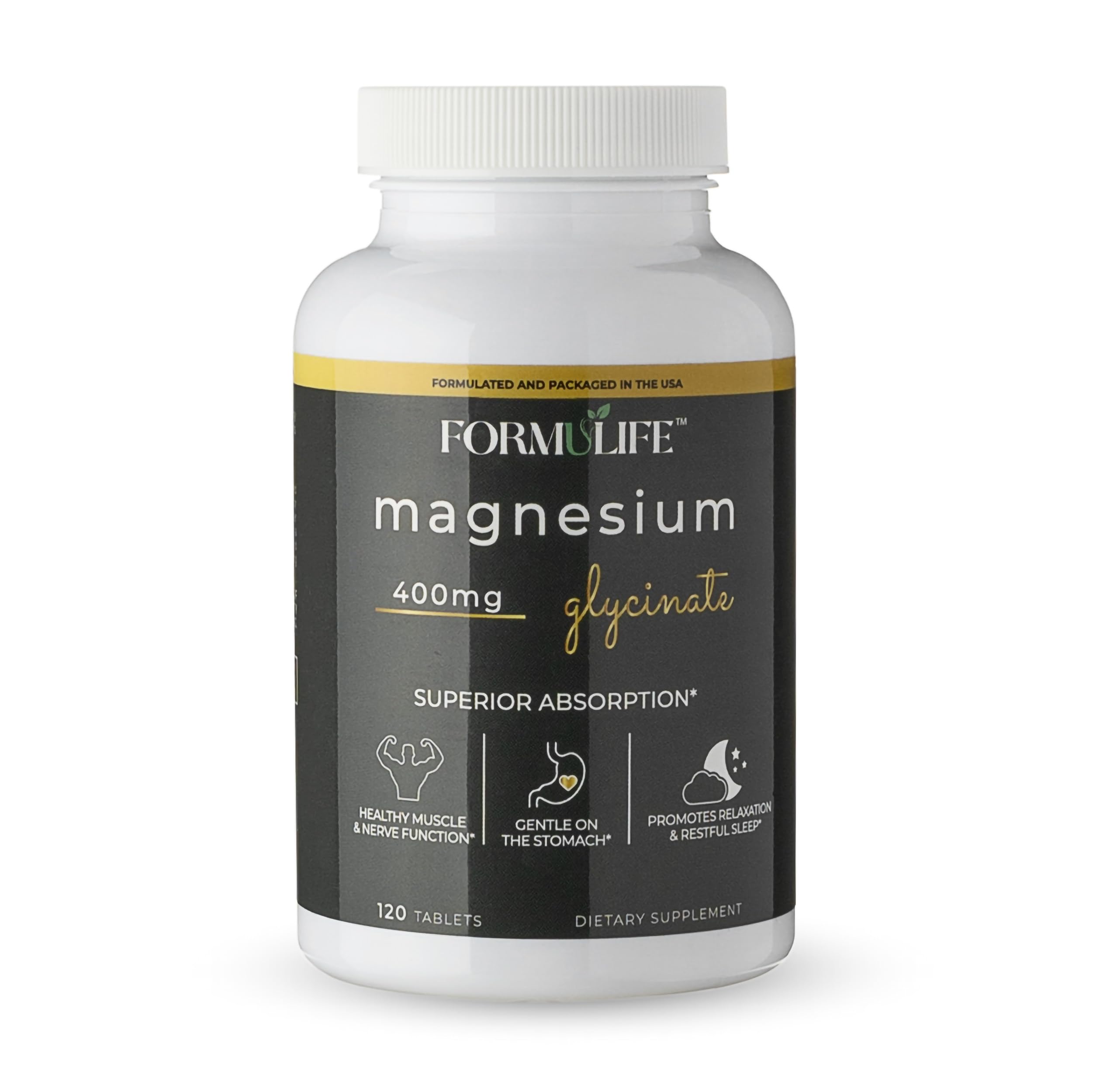 Formulife - Magnesium Glycinate 400 MG - 120 Tablets For Cramps, Supports Restful Sleep, Relaxation, Heart Health Vegan, Non-GMO, Made in USA