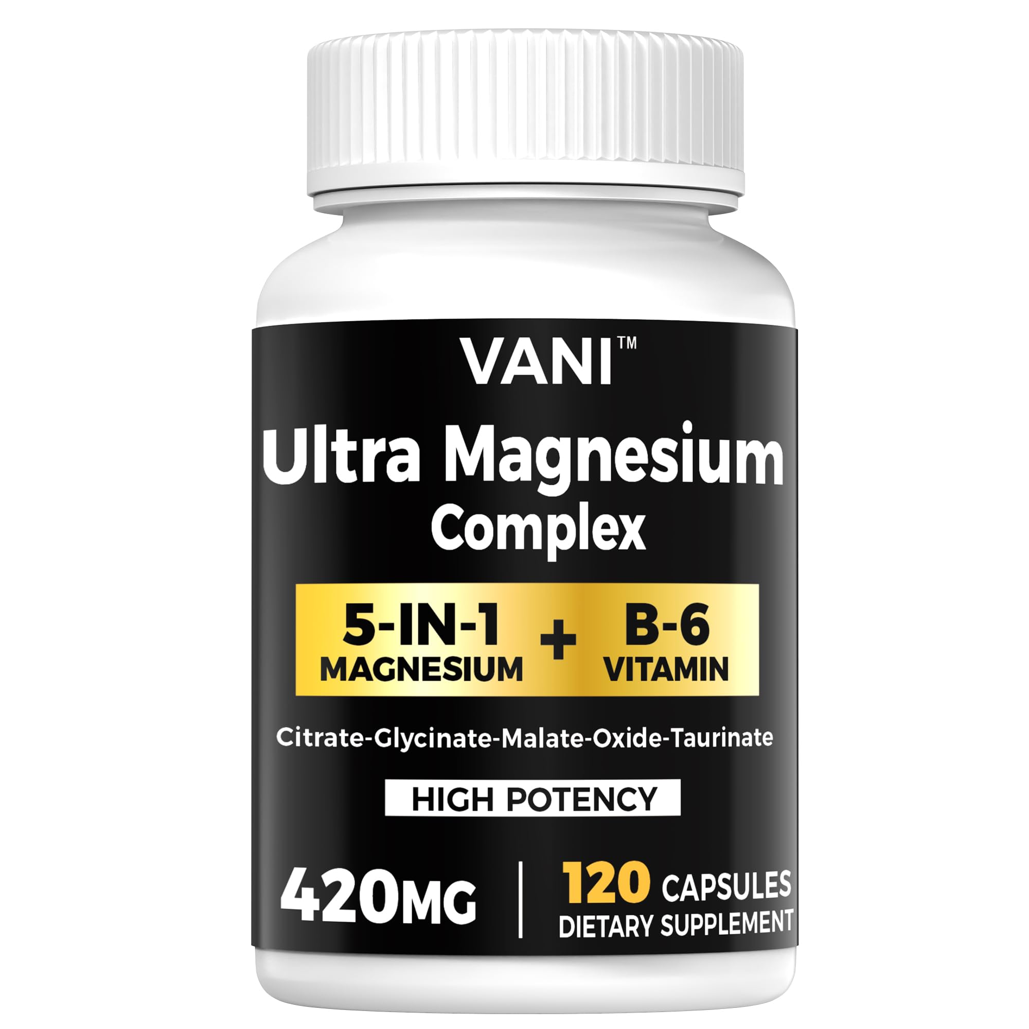 Magnesium Glycinate, (420mg) 5 in 1 Magnesium Complex & B6 Supplement for Nerve, Heart, Muscle Health & Relaxation*, Maximum Bioavailability & Absorption, Gluten Free, 120 Vegan Capsules