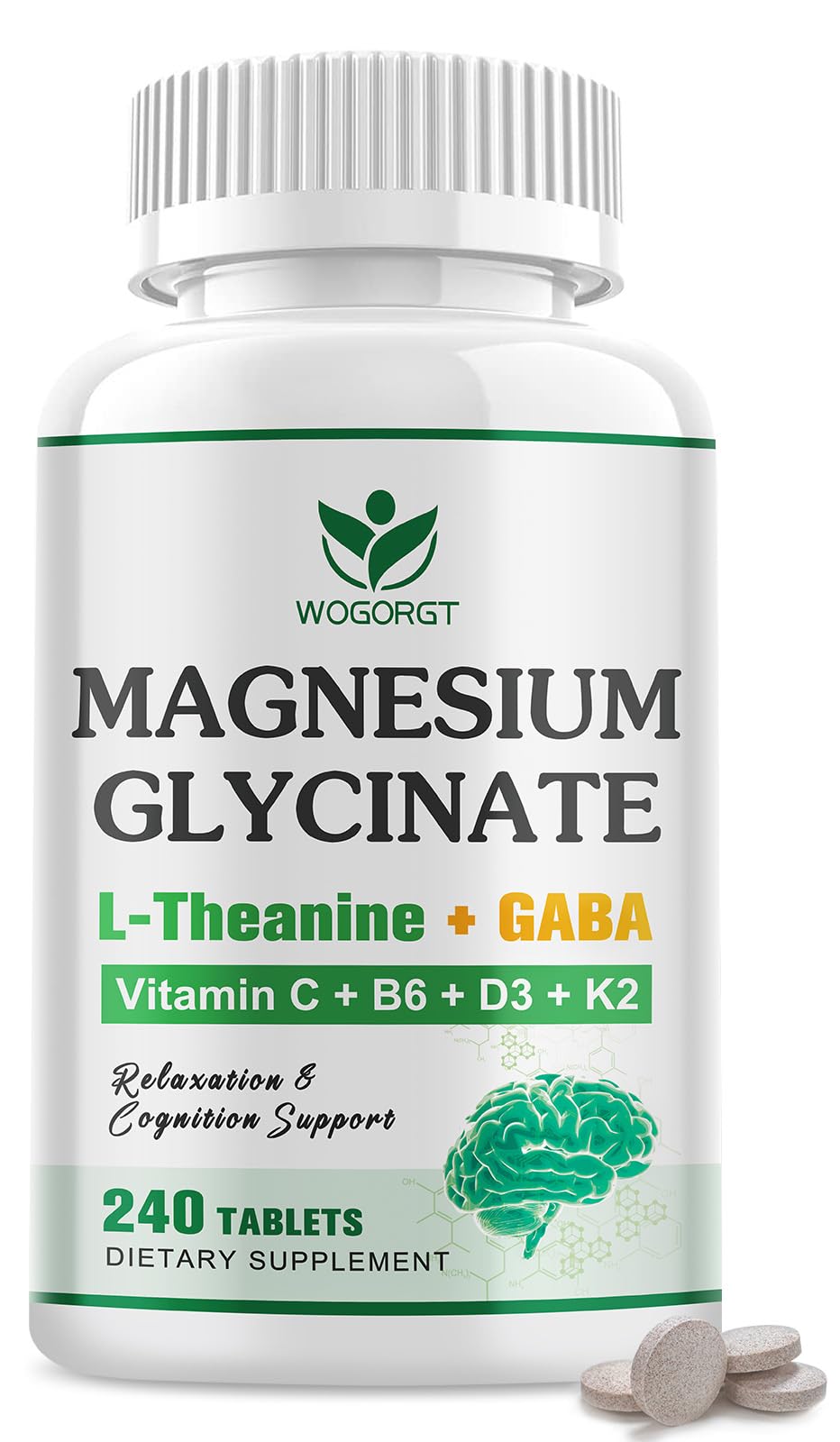 Clean Trusted Quality: High quality Magnesium Glycinate Supplement. Gelatin-free, gluten-free, non-GMO, cruelty-free and suitable for vegan. If you have any questions, please contact us and we will do our best to solve it for you. Smaller Easy to Swallow: I know taking pills everyday can be a challenge. Our magnesium glycinate tablets are small and round instead of oblong, and will be easier to swallow than the oblong ones. As a dietary supplement, take two tablets, twice per day. 60 day supply. Extra Strength for Growth Bone Support: Formulated with Vitamin D3 and K2 to work with calcium citrate for supports bone and overall wellness. Suitable for growing teenagers and adults who need to maintain bone strength. Supports Relaxation Bedtime Routine: WOGORGT magnesium glycinate tablets are extra added L-Theanine, GABA and chamomile extract. Those gentle ingredients promote a more relaxed state in the brain and helps teenagers and adults relaxation for restful evenings. Daily Mood Focus Balance: As essential minerals, magnesium plays a huge role in our life. Magnesium Glycinate is a new type of magnesium supplement, which can help supply the deficiency of magnesium. And magnesium glycinate combined with Vitamin B6, Vitamin C D3 supports focus, calm and daily balance. Perfect for teenagers feel restless or when adults need extra calm.