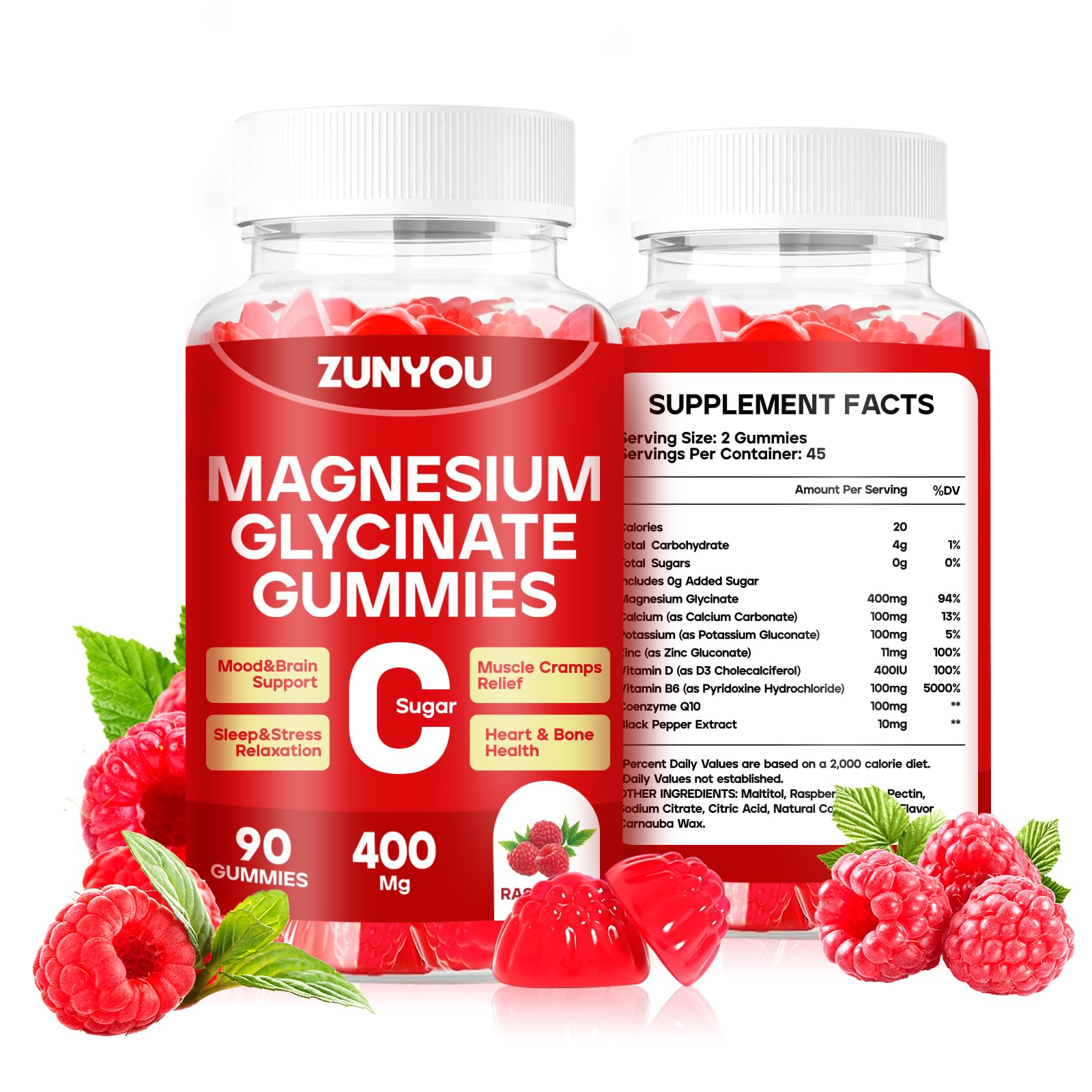 90 Gummies 45 Day Supply: This magnesium complex gummies was to provide more comprehensive nutritional support for people who need additional magnesium supplementation. Each bottle contains 90 gummies, which can last for 45 days. However, this does not mean that you must take 2 pieces each time. Since individual needs for nutrients vary greatly, you can refer to our ingredient list and reduce the number of pieces to take according to your own situation. Delicious Sugar-Free Taste: Enjoy our magnesium sugar-free gummies infused with a natural raspberry flavor. These soft and chewy magnesium gummies for women contain no sugar or artificial sweeteners, making them a tasty treat you can look forward to every day. Each serving of gummies strictly adheres to the adult daily safe upper limit standards, ensuring compliance with local safety regulations at the recommended dosage. Enhanced Nutrient Absorption: Infused with zinc and black pepper extract, our magnesium glycinate gummy improve nutrient absorption, ensuring your body maximizes the benefits of magnesium while being gentle on the digestive system. Premium Magnesium Glycinate 400mg Gummies: Our magnesium sleep gummies provide 400mg of magnesium glycinate. Added vitamin B6 helps magnesium work better, while coenzyme Q10 and potassium support the nervous system, improve memory and reduce inattention. Vitamin D promotes calcium absorption. Supports Sleep and Muscle Relaxation: Our calm magnesium gummies are designed to enhance sleep quality, calm the mood, and relax muscles. Pure magnesium glycinate helps prevent leg cramps while promoting better rest and overall health.