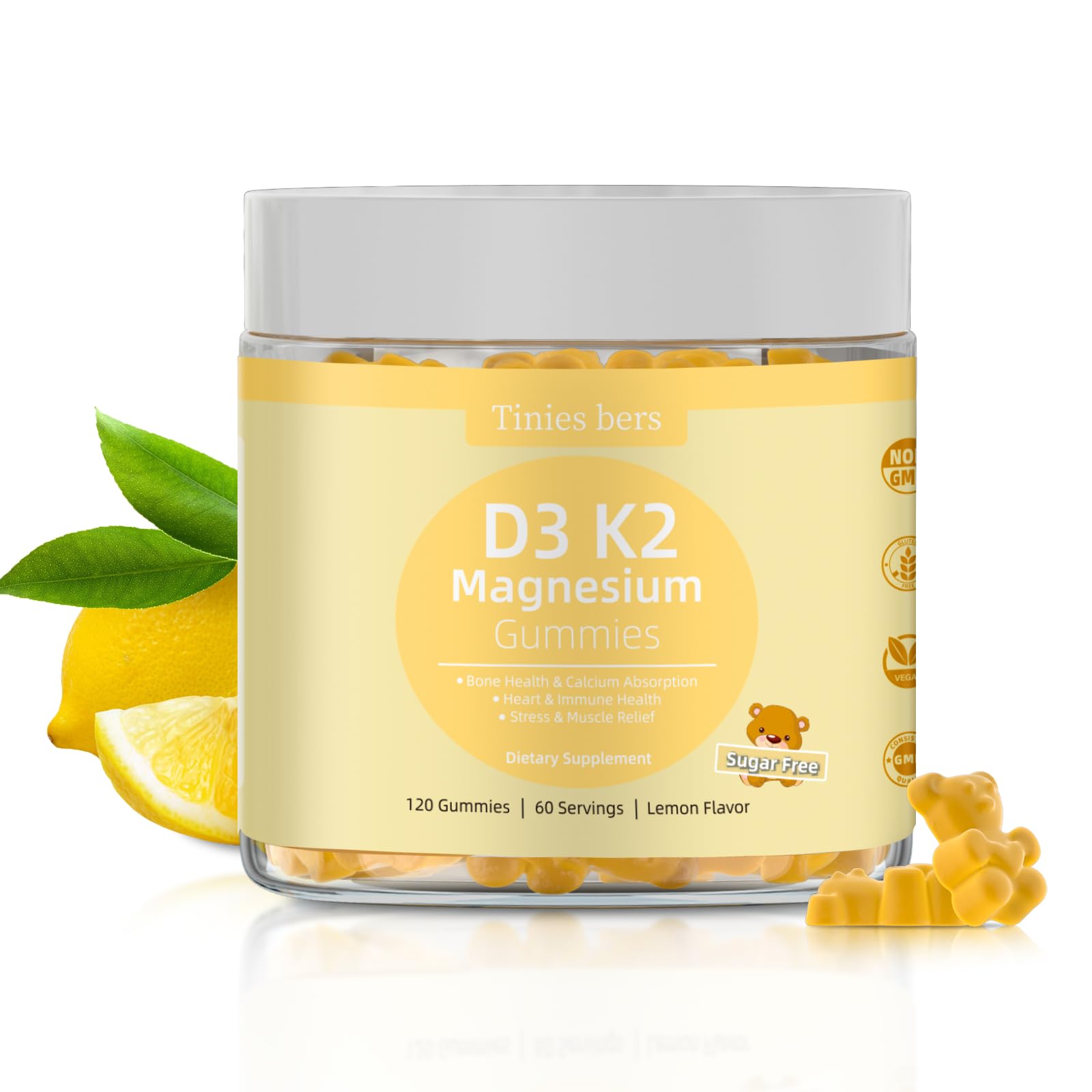 Yummy and Health: Tinies bers vitamin d3 k2 magnesium gummies with a soft texture and lemon flavor, are GMP compliant and Lab-tested. If you receive Tinies bers product with any problems, please contact us immediately. The EXP date and production batch number are at the bottom of each bottle. Sugar Free Gummies: All gummies supplements offered by Tinies bers are sugar free (no sugar or cane sugar), no sugar coating and no sugar within. The added xylitol replaces traditional sugar, giving magnesium glycinate d3 k2 gummies a sweet taste too. 1 1 1 3 Health Benefits: Magnesium glycinate support stress and muscle relief , sleep and nerve health. Together with vitamin D3, they promote calcium absorption and maintains calcium magnesium balance. Vitamin K2 guides calcium into the bones, supporting bone and immune health. K2 D3 Magnesium: Vitamin D3 5000IU and vitamin K2 100mcg. Higher doses are required because people have varying absorption efficiencies. Vitamin D3 K2 are good partners that can synergistically promote calcium absorption. Meanwhile, magnesium is also an essential mineral for calcium absorption. Magnesium Glycinate Gummies: Tinies bers magnesium gummies contain magnesium glycinate 500mg per serving. Magnesium glycinate is the most absorbable form of magnesium. 100 minerals magnesium supplement gummies!.