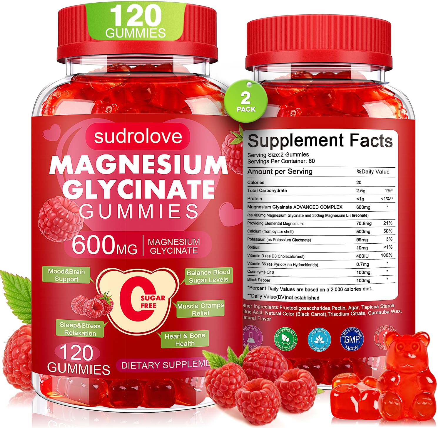 Magnesium Glycinate Gummies 600mg- Sugar Free Mg Potassium Supplement with Magnesium Glycinate, Vitamin D, B6 and CoQ10 for Calm Support & Sleep for Adults, 60 Days Supply ((Pack of 2), Raspberry) Raspberry 120 Count (Pack