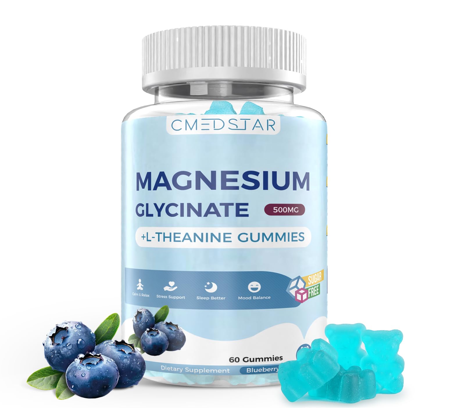 Delicious, Sugar-Free Vegan: Naturally flavored with blueberries, our magnesium gummies for kids and women are a tasty, convenient alternative to pills or powders. Free from sugar, artificial additives, and preservatives, CMEDSTAR gummies are crafted in GMP-certified facilities to ensure top-tier quality in every batch. Gentle Highly Absorbable Formula: Our magnesium glycinate kids formula is easy on the stomach and highly bioavailable, ensuring optimal absorption without digestive discomfort. This makes it a great choice for those seeking an effective yet gentle magnesium supplement. Better Sleep Restful Nights: Formulated with Chamomile Extract and Ashwagandha, our magnesium gummies for women and kids encourage a sense of tranquility and improve sleep quality. Chamomile helps soothe the nervous system, while Ashwagandha aids in stress management for a more restful night. Supports Stress Relief Relaxation: Featuring Magnesium Glycinate and L-Theanine, these gummies help ease daily stress and tension. Magnesium glycinate for kids supports relaxation and focus, while L-Theanine promotes a calm mind, making it an excellent supplement for both children and adults. Formulated for Whole Family Wellness: CMEDSTAR magnesium glycinate gummies for kids and women are designed to support relaxation, focus, and overall well-being. Our formula combines Magnesium Glycinate, L-Theanine, Ashwagandha Extract, and Chamomile Extract, providing a gentle and effective way to promote calmness and balance.