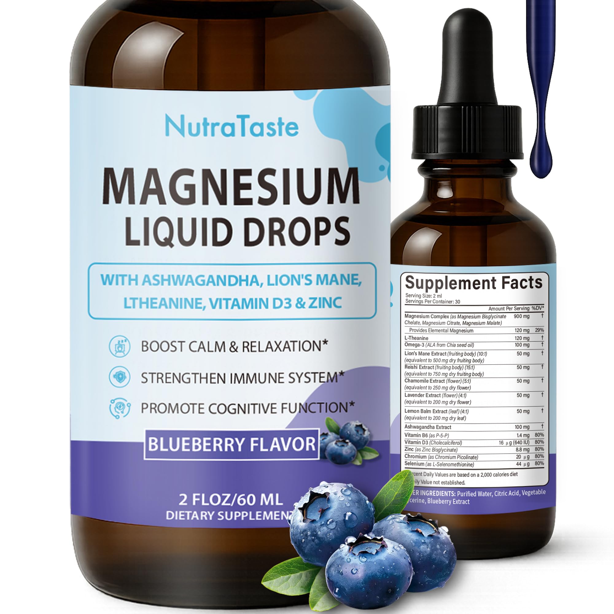 CLEAN TRUSTED FORMULA: Our liquid magnesium complex is made with no fillers, artificial flavors, or preservatives—fully vegan, non-GMO, gluten-free, and free from soy and dairy. Produced in cGMP-certified facilities that follow strict quality and safety standards, ensuring purity and reliability in every drop. EASIER TO TAKE BLUEBERRY FLAVOR: Simply take 2ml daily. Directly into the mouth or placed under the tongue or mixed into water or your favorite food. Experience the benefits of fast-absorbing liquid magnesium drops with a delicious natural blueberry flavor. Our liquid formula offers superior bioavailability compared to capsules or tablets, making it easy for your body to utilize the essential nutrients. HIGH-ABSORPTION LIQUID MAGNESIUM: Our liquid magnesium supplement absorbs up to faster than capsules, offering a gentle, easy-to-take alternative without swallowing large pills. With a simple 2 ml daily dose, you can take it directly or mix it into any drink. Use it in the morning to support calm focus and mental clarity, or in the evening to help promote relaxation and ease into rest—making it a convenient, versatile solution for daily wellness. These elemental magnesium is chelated or highly absorbable for maximum bioavailability. RELAXATION MIND-BODY BALANCE: This well-balanced blend is designed to work holistically. It aids in promoting a calm and relaxed state, supports cognitive function and mental clarity, and contributes to a healthy immune response. The formula also helps maintain proper nerve and bone function, providing foundational mineral support for overall vitality and balance. SCIENTIFICALLY BALANCED MAGNESIUM COMPLEX: Our Magnesium Liquid drops deliver delivers a science-backed 900 mg 3-form Magnesium Complex (Glycinate, Citrate, Malate) enhanced with L-Theanine, Ashwagandha, Lemon Clam and Omega-3 for balanced mind–body support. A targeted adaptogenic blend—featuring Lion's Mane, Reishi, Chamomile, and Lavender—pairs with essential nutrients like Vitamin D3 and Zinc to create a comprehensive, synergistic, and well-rounded daily wellness blend.