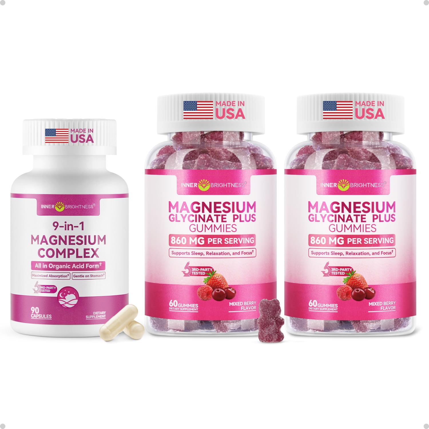 Magnesium Glycinate Plus Gummies 860mg for Adults Kids, Sleep 2 Pack 9-in-1 Magnesium Complex, 300mg Magnesium from 9 Organic FormsExpertly Selected Organic Magnesium: Not all magnesium is the same. Instead of using cheap inorganic forms like magnesium oxide, we use only nine carefully selected organic magnesium forms, such as glycinate, malate, and citrate, chosen for how the body recognizes and uses them—so you don't have to compare labels or research magnesium types. Expertly Selected Organic Magnesium: Not all magnesium is the same. Instead of using cheap inorganic forms like magnesium oxide, we use only nine carefully selected organic magnesium forms, such as glycinate, malate, and citrate, chosen for how the body recognizes and uses them—so you don't have to compare labels or research magnesium types. Whole-Body Magnesium Support: Unlike single-form magnesium that targets just one function, this 9-in-1 magnesium complex supports three essential body systems—Mind (sleep, stress, nerves), Body (muscles, energy, metabolism), and Balance (heart rhythm, cellular energy, hydration)—for more complete, balanced daily support. 100 mg Elemental Magnesium: Each serving provides 860 mg of magnesium compounds yielding 100 mg of elemental magnesium — the actual form your body uses. This formula is designed to support, not replace, magnesium-rich foods like nuts and leafy greens. Clean, science-backed, and incredibly easy to enjoy every day. Sugar-Free Sweetness: Our magnesium gummies deliver a delicious taste without any sugar. The light crystal coating is erythritol — a natural, low-glycemic sweetener used to keep the gummies from sticking together and to maintain a clean, smooth bite. A magnesium supplement you can enjoy daily with peace of mind.