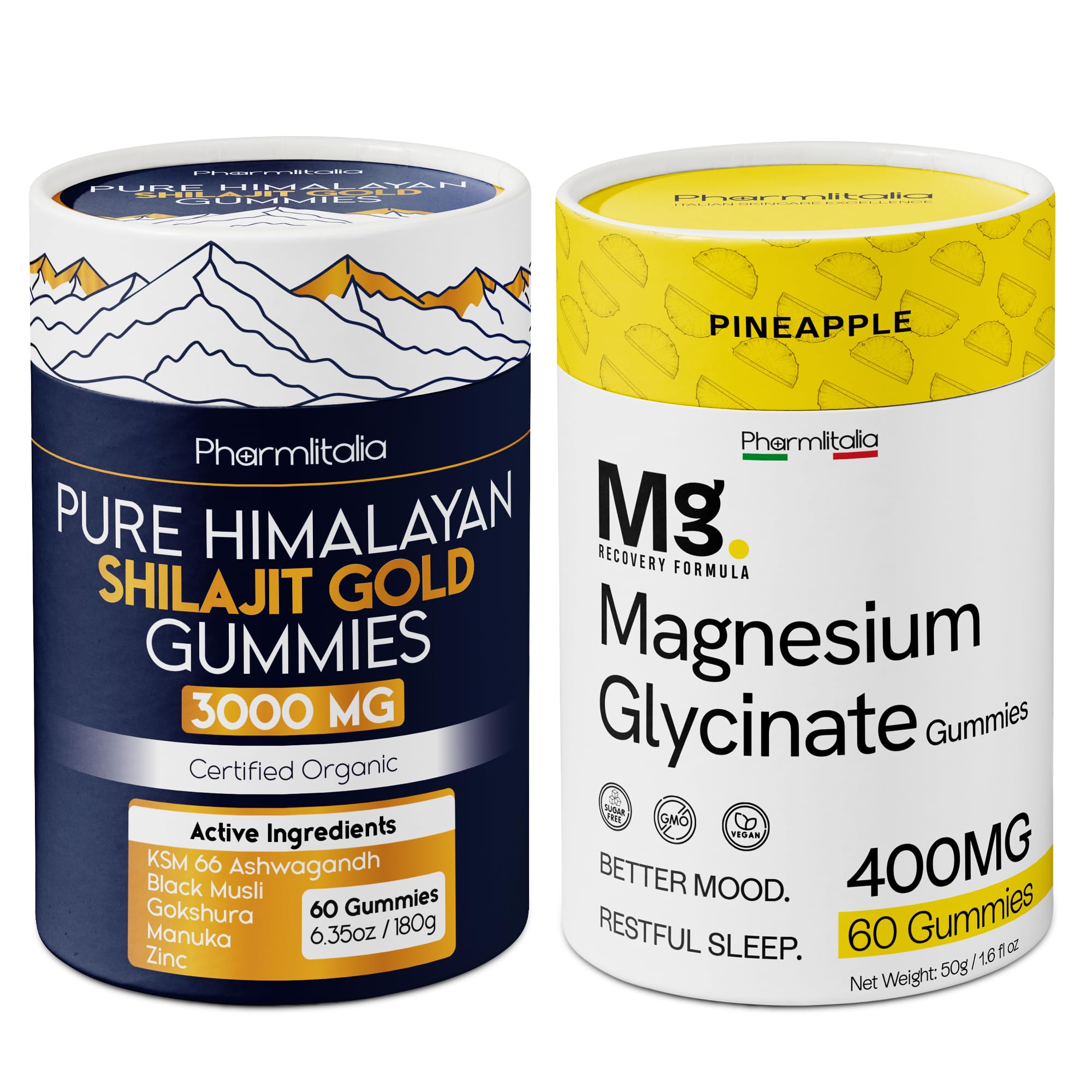 Support your mind and body with this premium 2-in-1 wellness bundle. Combining high-absorption Magnesium Glycinate Gummies and Pure Himalayan Shilajit Gold Gummies, this set helps you sleep deeper, recover faster, and feel revitalized every day. ✓ Magnesium Glycinate Gummies (400mg): Highly bioavailable magnesium promotes restful sleep, reduces muscle tension, relieves cramps, and supports energy metabolism. ✓ Pure Himalayan Shilajit Gold Gummies: Sourced at 18,000 feet, these potent superfood gummies with Shilajit, Ashwagandha, and Black Musli naturally boost strength, stamina, and recovery. Both formulas are vegan, clean-label, and delicious—crafted to help you perform your best and unwind with peace of mind.Vegan, Clean Pure Ingredients: Both supplements are non-GMO, gluten-free, soy-free, and free from artificial colors or preservatives—crafted with strict quality standards you can trust. Delicious Flavors Easy to Take: Enjoy tasty pineapple and natural herbal flavors in convenient chewable gummies—no pills needed. Perfect for men, women, and active lifestyles. Potent Shilajit Blend for Energy: 3000mg of pure Shilajit plus Ashwagandha, Black Musli, and Gokshura supports strength, stamina, and faster recovery. High Absorption Magnesium: 400mg per serving helps regulate nervous system function, promote deep sleep, and ease muscle fatigue after workouts or daily stress. Complete Wellness Support: Combines Magnesium Glycinate for better sleep, muscle relaxation, and calm with Shilajit Gummies for natural vitality, endurance, and daily resilience.
