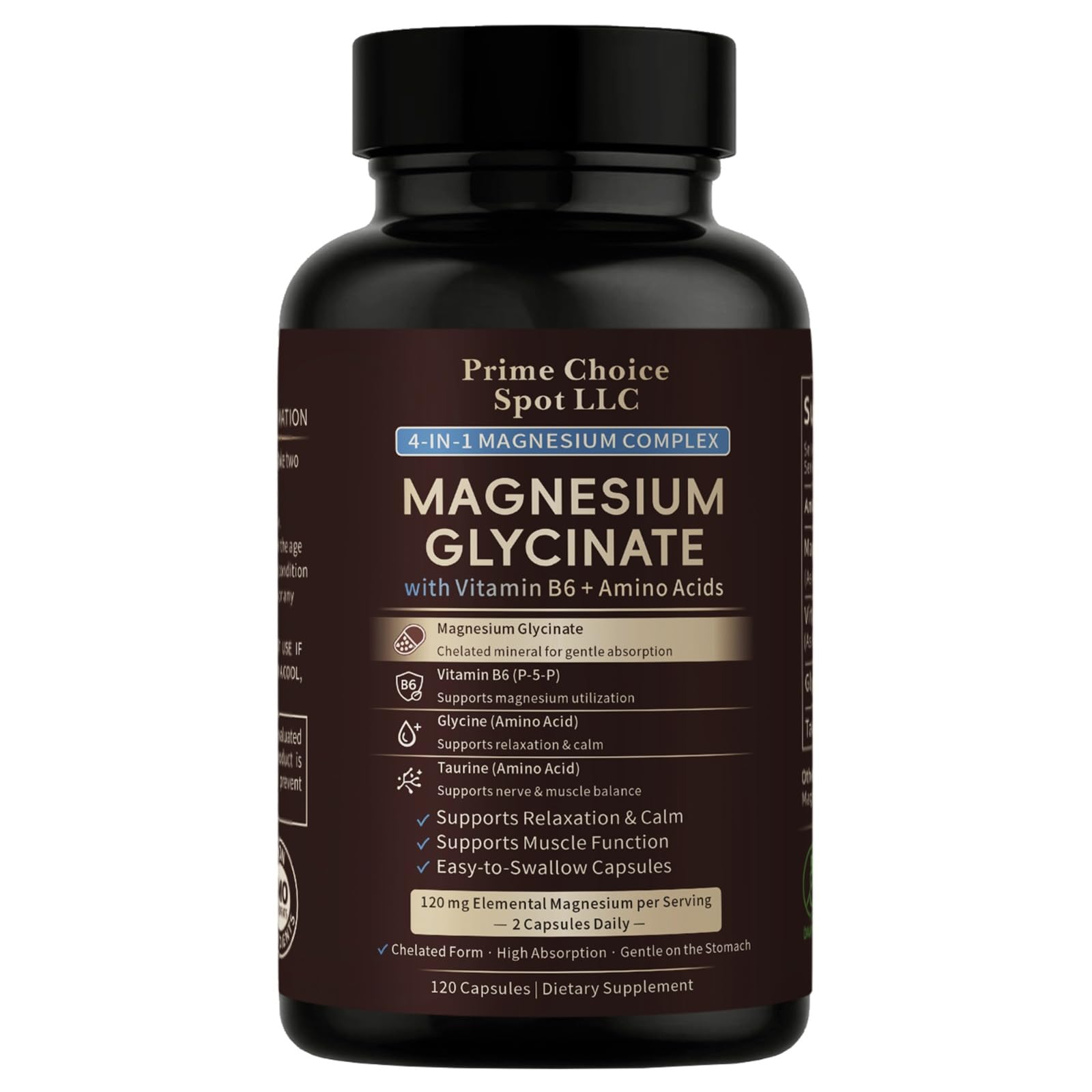 Many magnesium supplements rely on high doses and harsh forms that can be difficult on digestion. This formula takes a different approach. Prime Choice Spot Magnesium Glycinate is designed for daily magnesium supplementation, using a moderate, clearly disclosed amount of chelated magnesium, combined with amino acids and active vitamin B6 (P-5-P) to support absorption and consistency. Magnesium glycinate is widely valued for its high bioavailability and gentle profile. Glycine and taurine are naturally occurring amino acids commonly found in the body and diet, while vitamin B6 (P-5-P) supports normal nutrient utilization. Together, they form a thoughtfully balanced formula focused on digestive comfort and quality formulation — not excessive dosing. This product is ideal for adults seeking a non-laxative, easy-to-tolerate magnesium supplement as part of their daily wellness routine. Product Benefits: Daily balance recovery support Supports normal muscle function Gentle on digestion Highly absorbable chelated magnesium Daily magnesium supplementation Non-laxative formula Thoughtfully formulated with amino acids