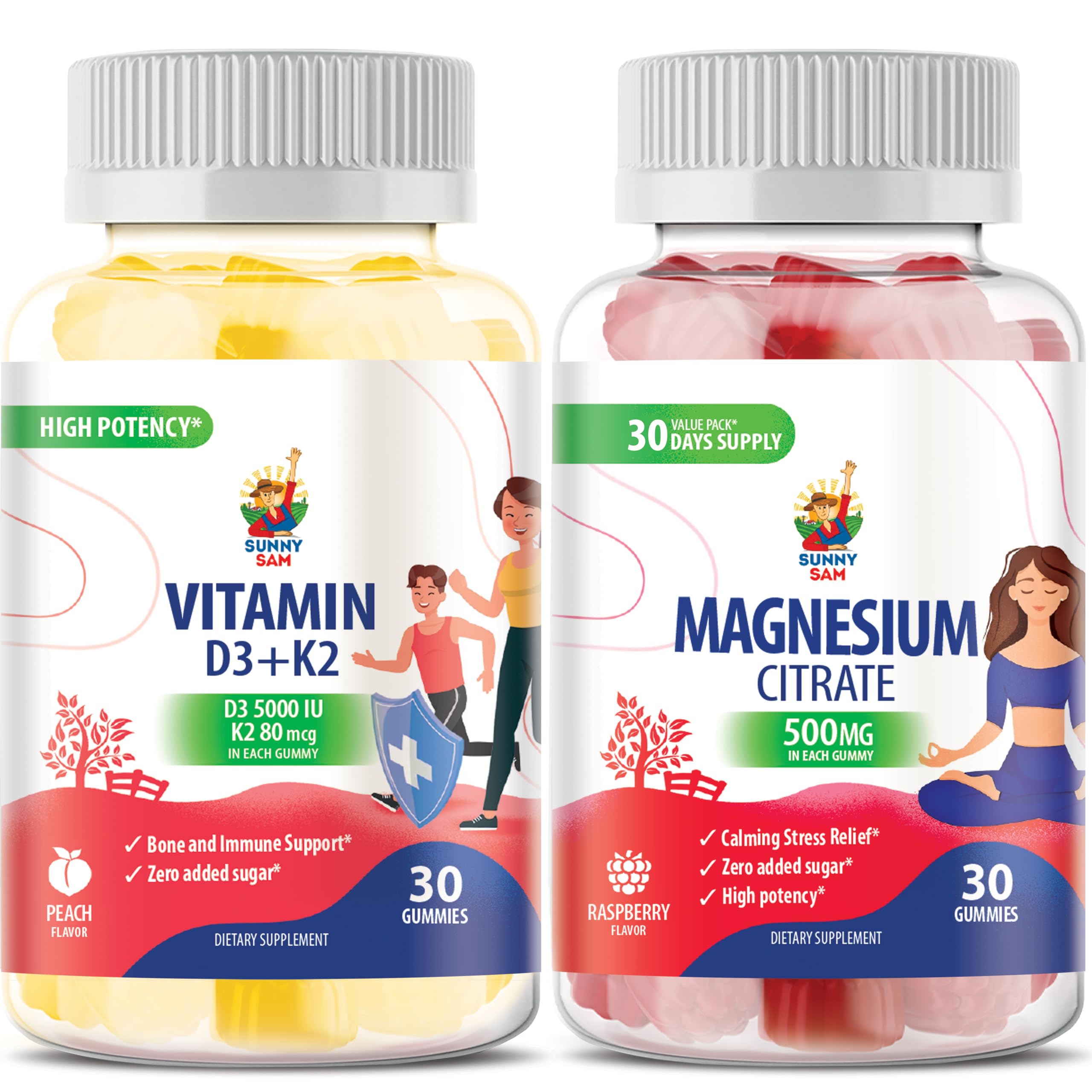 Our magnesium gummies, offer a sugar-free option for families, promote tranquility, are natural and vegetarian, and boast a delicious raspberry flavor loved by kids. Flavor: Raspberry Form: Chewable Gummy Magnesium: 500mg FEATURES: Pectin based, vegan vegetarian friendly. Non-GMO, gluten dairy free, keto-friendly, sugar-free. Contains no artificially derived colors or flavors. At Sunny Sam Labs, we are committed to meticulously selecting top-quality ingredients for our products, prioritizing their effectiveness while considering the body's natural capacity for optimal absorption. Although the body can generate Vitamin D from sunlight exposure, a deficiency is widespread among individuals, even those residing in sunny regions, owing to various contributing factors. Moreover, the significance of obtaining an adequate calcium intake becomes incregly important as you age and bone density diminishes. Vitamin K2 plays a pivotal role in facilitating the transport of calcium from the bloodstream to the bones, preventing excessive calcium deposition in blood vessels, and supporting muscle well-being. Our Vitamin D3 K2 Complex is specially formulated to meet the heightened Vitamin D requirements of those with deficiencies. This blend of vitamin D3 and vitamin K2 offers superior support for immune and cardiac health, as well as promoting the well-being of bones, muscles, and teeth. We strongly advise testing your blood's vitamin D3 levels and consulting a healthcare professional prior to initiating the consumption of Vitamin D3 K2. SPECIFICATIONS: Quantity: 30 Gummies (1 per serving) Flavor: Peach Form: Chewable Gummy Vitamin D3: 5000 IU (125 mcg as Cholecalciferol) Vitamin K2: 80 mcg as MK-7 (Menaquinone-7)NATURAL VEGETARIAN - Our 500mg magnesium gummies for kids are made without any artificial flavors or colors They are non-GMO, gluten-free, and crafted with high-quality ingredients, making them perfect for children. IRRESISTABLE TASTE - Enjoy our sugar-free, non-GMO, gluten-free, dairy-free vegetarian gummies with peachy flavor. PROMOTES TRANQUILITY - Magnesium citrate is known for its effective mood support, helping you stay calm and composed. BOOSTS IMMUNITY STRENGTHENS BONES - Sunny Sam Vitamin K2 D3 Gummies maintain vital calcium-phosphorus balance, essential for teeth, bones, muscles, and joints. . CALM AND RELAXATION SUPPORT - Our chewable magnesium gummies promote relaxation and help in resting easily Improve your recovery quality with these kids magnesium citrate gummies. .
