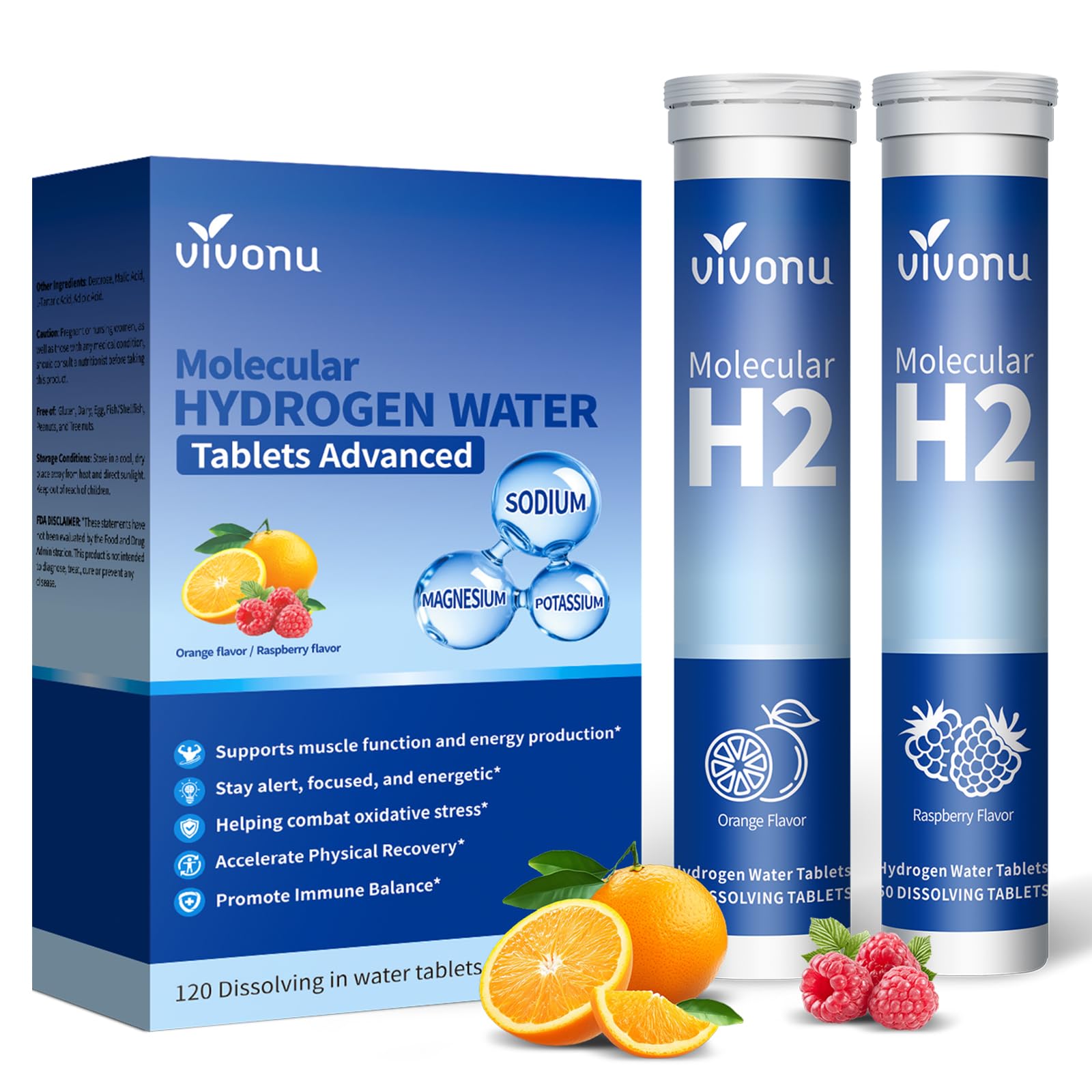 COMPLETE WELLNESS IN EVERY SIP! More than just great taste, this is a comprehensive health boost. Vitamin C D fortify your immune system, while the magnesium complex supports muscle relaxation and better sleep. This daily hydrogen water ritual promotes overall vitality, cognitive function, and cellular health, making hydration the highlight of your day. DELICIOUS, CONVENIENT ZERO SUGAR! Ditch boring drinks and messy electrolyte packets. Our effervescent tablets dissolve quickly for a crisp, satisfying fizz. With two delicious sugar-free flavors in one box, staying hydrated is a treat. Perfect for the gym, office, or travel—just drop a hydrogen tablet for drinking water and enjoy. THE PERFECT ELECTROLYTE DRINK FOR ACTIVE LIFESTYLES! Never get bored with your sports nutrition again! Choose zesty Orange pre-workout for a kick or sweet Raspberry post-workout for refreshment. As a top-tier electrolyte replacement drink, it replenishes minerals faster than sugary electrolyte powders, supporting endurance and rapid recovery without the crash. ? SUPERCHARGE YOUR WATER WITH SCIENCE TASTE! Enjoy the dual benefits of delicious flavor and advanced wellness. Our molecular hydrogen tablets create hydrogen water to fight oxidative stress, while the premium electrolytes and magnesium work to boost energy, prevent cramps, and enhance recovery. A tasty magnesium supplement you'll love taking daily. DOUBLE THE FLAVOR, ULTIMATE HYDRATION! Get the best of both worlds with our 2-bottle pack featuring refreshing Orange and tangy Raspberry! Each hydrogen water tablet transforms plain water into a fizzy, antioxidant-rich electrolyte drink, packed with Magnesium Complex, Sodium, Potassium, Vitamin C D for unbeatable taste and rapid hydration.