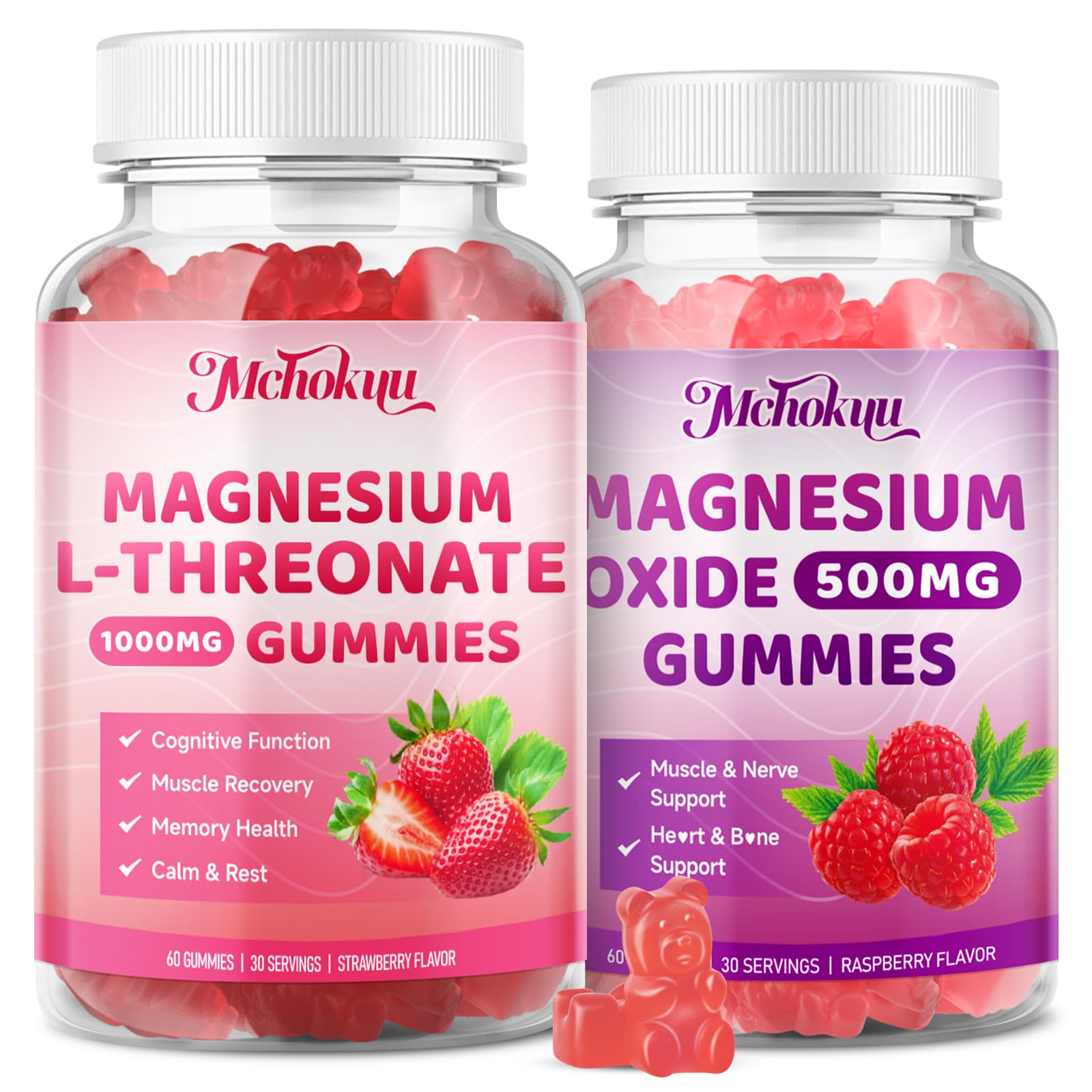 Magnesium L-Threonate Gummies 1000mg Strawberry & Magnesium Oxide Gummies 500mg Raspberry Flavor 120 Counts Bundle