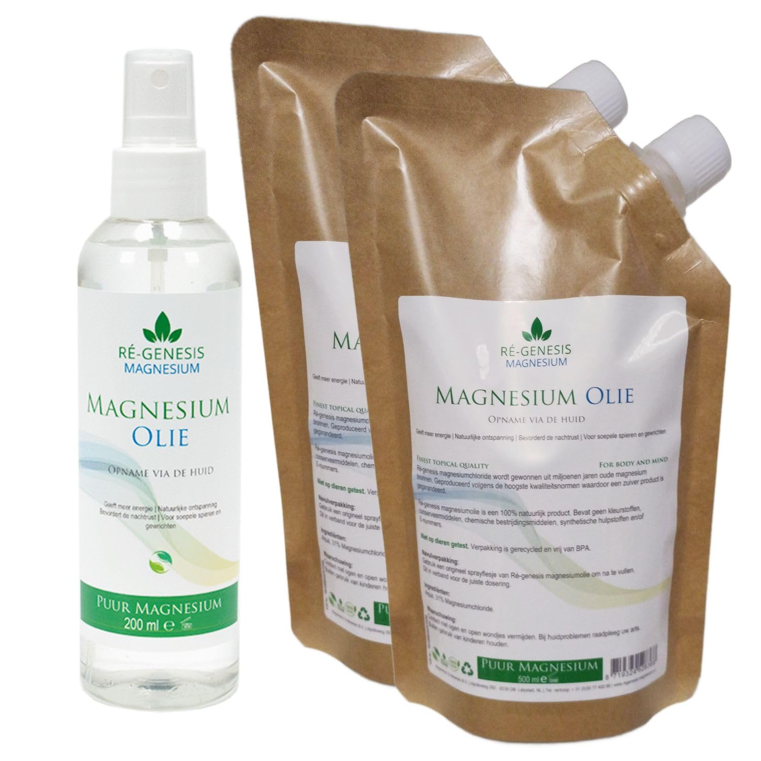 For heavy consumers, the 2x400 ml refill stand-up pouch with the 200 ml bottle of magnesium oil is the best offer. The 200 ml bottle can be used at home to apply the magnesium. With the affordable refill bottle you will not run out of magnesium oil for the time being. Ré-genesis magnesium oil is 100 natural, very pure and without any additives. Ré-genesis magnesium oil, easily and quickly replenish your magnesium level The perfect way to relax and provide relief from muscle cramps and pain Magnesium supports the energy level and contributes, among other things, to the normal functioning of the nervous system Ré-genesis magnesium oil. Ré-genesis magnesium oil spray contains a significantly high concentration of magnesium chloride (31 ) Ingredients magnesium flakes: Aqua, magnesium chloride (31 ) INGREDIENTS Aqua, magnesium chloride 31MAGNESIUM OIL 31 - The magnesium chloride concentration of our magnesium oil is 31 and is therefore ideally suited for transdermal magnesium absorption through the skin. MAGNESIUM THE MIRACLE MINERAL - Activates your natural energy, reduces muscle cramps, relaxes the muscles and helps with fatigue. 100 NATURAL - Our magnesium oil is 100 natural and contains no dyes, fragrances or preservatives. 1000 ML 100 ORIGINAL REGENESIS MAGNESIUM - The magnesium oil is 100 natural, very pure and powerful. Ideal for everyday use.Magnesium olie spray van Regenesis 2x400 ml navul stazak en 200 ml magnesium spray Magnesiumchloride 31 Goed voor de spieren. Voor de grootverbruiker is de 2x400 ml navul stazak met het 200 ml flesje magnesiumolie de beste aanbieding. Het 200 ml flesje is thuis te gebruiken om de magnesium aan te brengen. Met de voordelige navulfles kom je voorlopig niet zonder magnesiumolie te zitten. Ré-genesis magnesium olie is 100 natuurlijk, zeer zuiver en zonder enige toevoeging. Ré-genesis magnesium olie, gemakkelijk en snel je magnesiumniveau aanvullen De perfecte manier om te ontspannen en verlichting bieden bij spierkramp en spierpijn Magnesium ondersteunt het energieniveau en draagt o.a bij tot de normale werking van het zenuwstelsel Ré-genesis magnesiumolie. Ré-genesis magnesium olie spray bevat een aanzienlijke hoge concentratie magnesiumchloride (31 ) Ingrediënten magnesium vlokken: Aqua, magnesiumchloride (31 ) INGREDIËNTEN Aqua,magnesiumchloride 31MAGNESIUMOLIE 31 - De magnesiumchlorideconcentratie van onze magnesium olie is 31 en is daarom bij uitstek geschikt voor transdermale magnesiumopname via de huid. MAGNESIUM HET WONDERMINERAAL - Activeert je natuurlijke energie, verminderd spierkramp, ontspant de spieren en helpt bij vermoeidheid. 100 NATUURLIJK - Onze magnesium olie is 100 natuurlijk en bevat geen kleurstoffen, geurstoffen of conserveringsmiddelen. 1000 ML 100 ORIGINEEL REGENESIS MAGNESIUM - De magnesium olie is 100 natuurlijk, zeer zuiver en krachtig. Ideaal voor dagelijks gebruik.