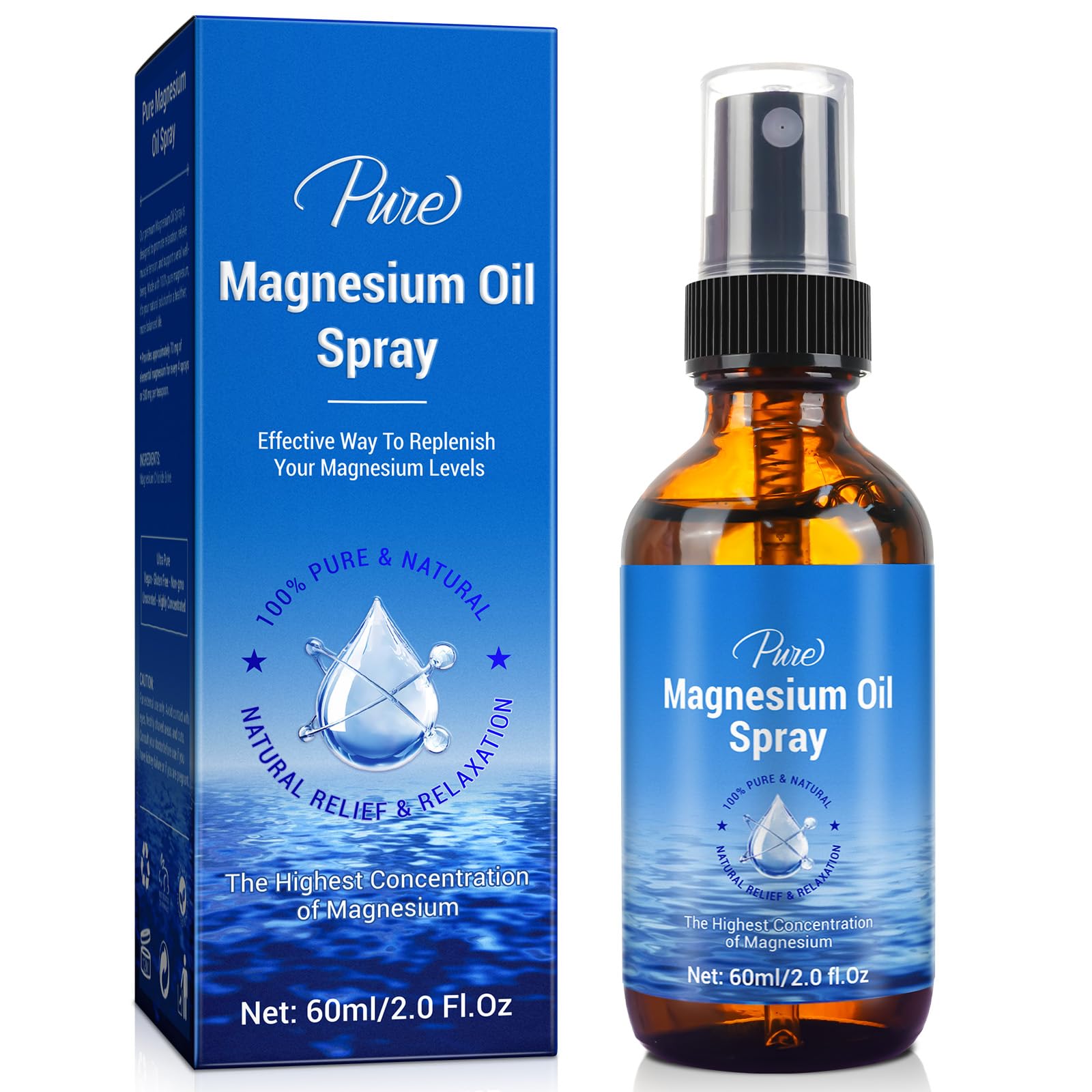 How to Use:our magnesium spray contains a new advanced formula, 4-5 sprays on problem areas or soles of the feet can provide you with 100 -125mg of natural magnesium, then massage it in well until it is fully absorbed. Portable and Easy to Use:Our pure magnesium oil spray comes in a glass bottle, simple to press and easy to use, fits in your bag perfect for carrying with you at all times. You can use it anytime at home, office or travelling. More Benefits: Our magnesium oil spray is perfect after a workout or a busy day, and is a natural pick-me-up to rejuvenate and revitalise, and can be used as a deodorant and foot spray. Fast Absorption:The refreshing spray is easily and evenly applied to the feet, skin or scalp and is quickly absorbed, leaving you rejuvenated, moisturised and nourished with healthy ski. Pure Magnesium: We use high quality Magnesium Chloride formulated with pure water , 100 natural, a simple, chemical free solution to maximise magnesium replenishment in the body without any additives.