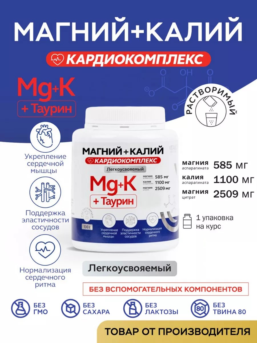 Специальная сердечная формула для сердца и сосудов усилена таурином! Кардиокомплекс от Компании Витаукт — стабильная работа сердца, здоровый сон, антистресс! Цитрат магния положительно влияет на работу сердца, участвует в регуляции частоты сердечных сокращений, обладает сосудорасширяющим действием, нормализует артериальное давление. БАД для сердца снижает риск развития инфаркта и других сердечно-сосудистых заболеваний. Магний необходим для передачи нервных импульсов и предотвращает развитие мышечных спазмов. Снижение уровня магния и калия в крови приводит к изменению сердечного ритма и тонуса сосудов, что, в свою очередь, может привести к повышению артериального давления, атеросклерозу коронарных артерий, аритмии и метаболическим изменениям в миокарде. Прием магния и калия позволяет компенсировать недостаток этих электролитов в пище. Магний способствует расслаблению сосудов и, соответственно, снижению давления. Магния цитрат- легкоусвояемая форма, способствует повышению устойчивости организма к стрессу, нормализации сна, поддержке нервной системы, сохранению эмоционального баланса, снятию спазмов и судорог мышц, поддержанию здоровья сердечно-сосудистой системы, снижению частоты и интенсивности приступов мигрени. Магний и калий способствует улучшению тонуса сердечной мышцы, улучшению метаболизма миокарда, поддержанию эластичности стенок сосудов. Калий участвует в поддержании гомеостаза - нормализует водно-солевой баланс и способствует уменьшению отеков. Применение таурина при сердечно-сосудистой недостаточности ведет к уменьшению застойных явлений в малом и большом кругах кровообращения: снижается внутрисердечное диастолическое давление, повышается сократимость миокарда. Препарат рекомендован для устранения дефицита калия и магния в составе комбинированной терапии при различных проявлениях ишемической болезни сердца (включая острый инфаркт миокарда); хронической сердечной недостаточности; нарушениях ритма сердца. В суточной дозировке (2 мерных ложки без горки) содержится 443 мг элементарного магния, 1000 мг элементарного калия, таурин -106 мг. Перед употреблением содержимое 1 мерной ложки развести в стакане горячей воды.