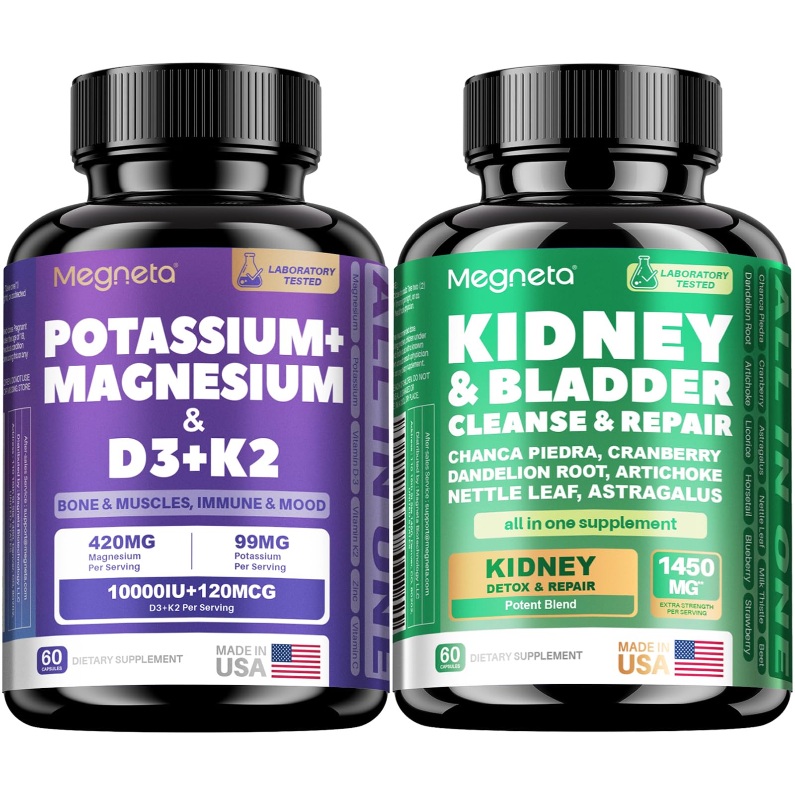 Magnesium Potassium Vitamin D3 K2 10000IU Supplement and Liver Kidney Cleanse Detox Repair Support SupplementImmune Boosting Antioxidant Protection: Enhanced with Berry and Herbal Blend for antioxidant benefits that help combat oxidative stress and support healthy inflammation response. Natural Liver Digestive Aid: Contains Milk Thistle, Artichoke, and Licorice Root to support liver function, bile production, and healthy digestion – ideal for those with rich diets, late-night meals, or social drinking habits. Comprehensive Kidney Bladder Support: Features a powerful herbal blend including Chanca Piedra, Cranberry, Dandelion Root, and Astragalus to promote detoxification, urinary tract health, and help reduce the risk of kidney stones. Best Absorb Bioavaible: Vitamin D3 and K2 work synergistically to improve calcium absorption, directing it to bones and teeth while reducing calcification in blood vessels and soft tissues. Magnesium and Potassium support muscle relaxation, nerve function, and mood regulation, while also regulating heart function and blood pressure. Each nutrient enhances the effectiveness of the others, boosting overall absorption by up to 90 for optimal health benefits. 4 IN 1 Supports Bone, Heart, Immune Health Mood Balance: Our advanced formula combines extra strength 10000 IU Vitamin D3, 120MCG K2, 420MG Magnesium, and 99MG Potassium. The four nutrients work synergistically, enhancing each other's absorption and promote strong bones, a healthy heart, a robust immune system, and balanced mood. This powerful blend ensures your body gets the essential nutrients it needs for overall wellness.
