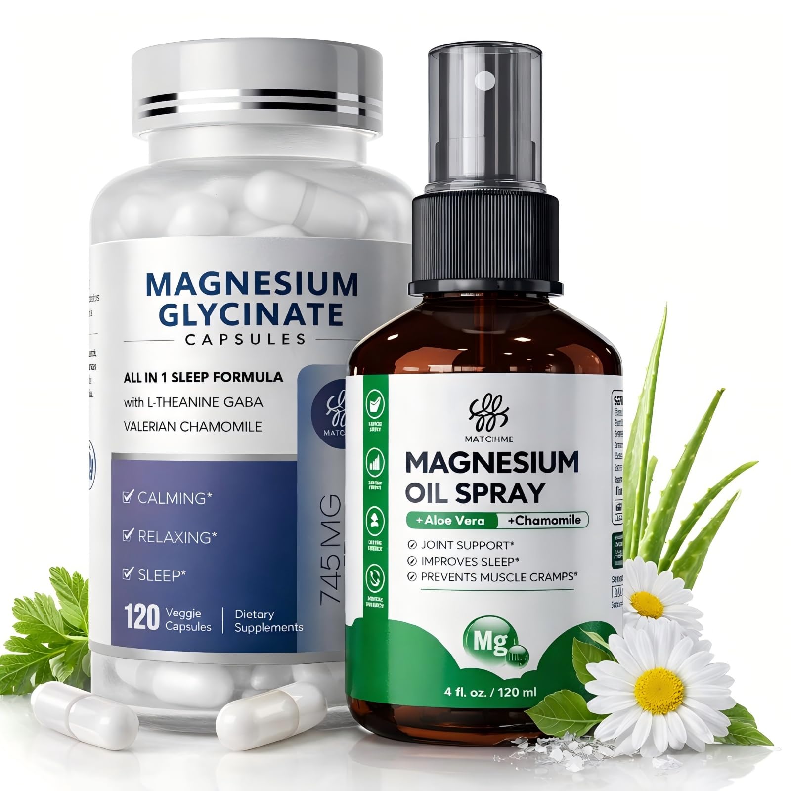 Clean Ingredients You Can Trust: Both products are made with carefully selected ingredients and produced under strict quality standards. Vegan, non-GMO, alcohol-free, gluten-free, and free from artificial colors or preservatives. If you have any questions, our customer support team is always here to help. Perfect for Nighttime Relaxation Daily Recovery: Use the magnesium spray after workouts or before bed for targeted muscle comfort, while taking the magnesium capsules as part of your evening routine to support calmness and sleep quality. An ideal solution for leg cramps, muscle tension, busy lifestyles, and stress-related restlessness. High-Absorption Magnesium Glycinate Capsules for Sleep Calmness:Each serving delivers Magnesium Glycinate (850mg) combined with L-Theanine, Chamomile, Valerian, and GABA, designed to promote relaxation, support restful sleep, muscle and nerve function, and overall wellness—gentle on the stomach and easy to take. Magnesium Oil Spray with Aloe Vera, Chamomile Peppermint:The topical magnesium spray is formulated with magnesium chloride blended with Aloe Vera (moisturizing), Chamomile (soothing), and Peppermint (cooling) to help reduce the typical tingling sensation of magnesium oil. Non-greasy, fast-absorbing, and suitable for frequent use on feet, legs, shoulders, and joints. 2-in-1 Magnesium Support (Topical Oral) :This magnesium bundle combines a Magnesium Oil Spray for targeted, topical use with Magnesium Glycinate Capsules for daily internal support—designed to support relaxation, muscle comfort, joint health, and sleep, day and night.