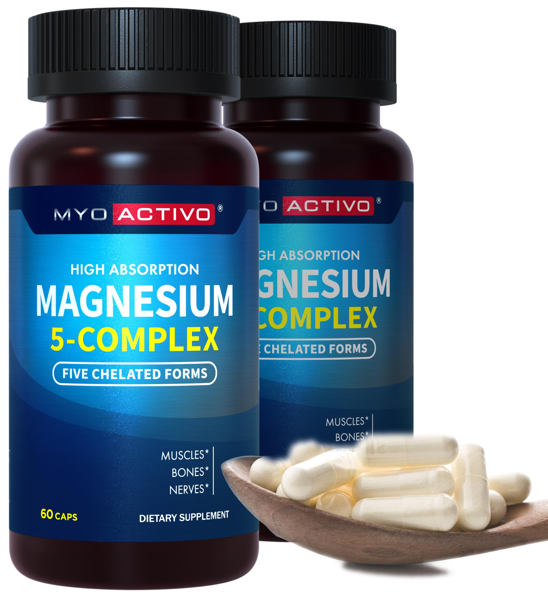 MADE IN THE USA – 3rd Party Tested Quality: MyoActivo Magnesium Complex is made in the USA at a NSF-registered cGMP facility and is 3rd party tested for purity and accuracy. Every magnesium pill is completely vegan friendly. It is gluten-free, soy-free non-GMO, sugar-free, and contains no fillers, yeast or preservatives. Supports MIND - MyoActivo chelated magnesium supplement supports healthy nerves and muscles throughout your body. This magnesium helps enhancing mental clarity and cognitive functions, contributing to overall brain health. MUSCLE BONE: 5-in-1 Magnesium glycinate and malate chelate support muscle which can help with muscle cramps. Our pure magnesium formula supports exercise, promotes healthy bone density and strength, promoting long-lasting skeletal well-being and an active lifestyle. MAGNESIUM COMPLEX: Contains 5 forms the bioavailable forms of magnesium: glycinate, malate, citrate, taurate, and aspartate. Each type is a chelated magnesium highly absorbed by the body. Our magnesium supplement is lab tested 3x throughout its production to certify its purity and ensure optimal absorption in the body.