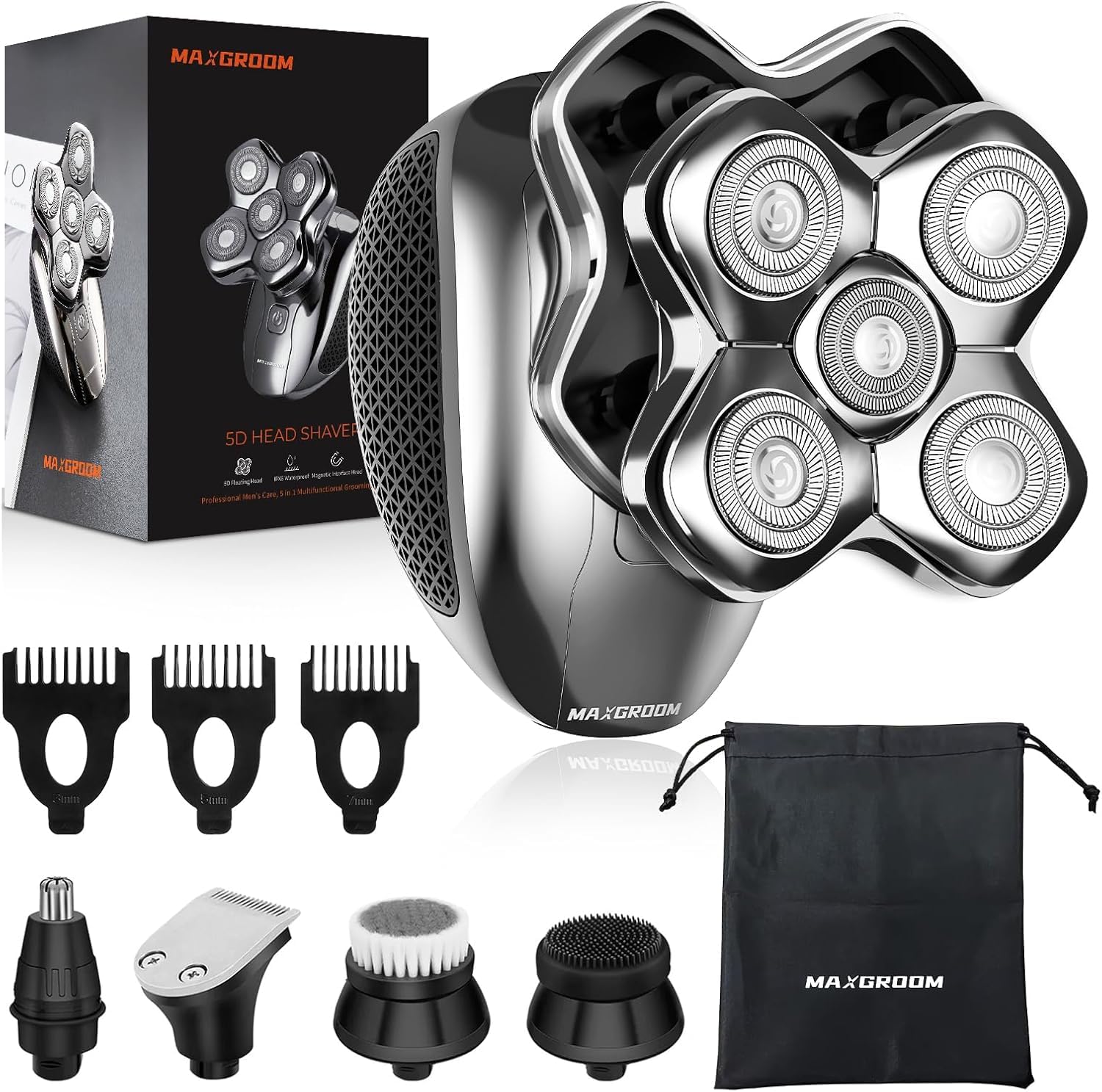 ?Excellent After-Sales Service?MAXGROOM always stand behind this electric head shaver and customers always rank top for us; We provide 12-month free replacement service and lifelong product problem solving, just feel free to contact us if you have any questions. ?Multifnctional Grooming Kit for Travel?This 5-IN-1 electric hair razor for men comes with rechargebale head shaver, precision hair trimmer, nose trimmer, 3 guide combs(3/5/7mm), face cleaning brush, head massaging brush, it can easily meet all your daily grooming and cleaning needs. Lightweight with a travel pouch, perfect for travelling, vacation, business trips. ?Intelligent LED Display?The LED Display accurately shows the battery level in real time and reminds you of charging the bald head razor in time. 1.5 hours full charge supports 90 minutes of continuous use. ?IPX7 Waterproof For Wet & Dry Use?Engineered with an IPX7 waterproof rating, this mens head shaver can be used in both wet and dry conditions, offering versatility and convenience. Enjoy head shaving in the shower and easily rinse under running water for effortless cleaning. ?Detachable Magnetic Shaving Head?The shaver body and entire shaving head are connected by magnets, so it is very easy and convenient to detach the entire shaving head, just simply raise the head upward, then the entire blade can be easlily detached and washed, this makes our head shavers for men are easier to clean than other brands, all hair residue can be cleaned thoroughly after each shave, the easy maintenance keeps this mens head shavers always in excellent condition. ?360°Floating & Flexible Shaver Head?MAXGROOM bald head shaver adopts 360°flexibly floating shaver head, closely following the contour of the scalp, face and neck to ensure a larger contact area and a close shaving every time; The high-speed powerful motor removes more hairs during each shave, delivering a faster and more efficient shaving experience.