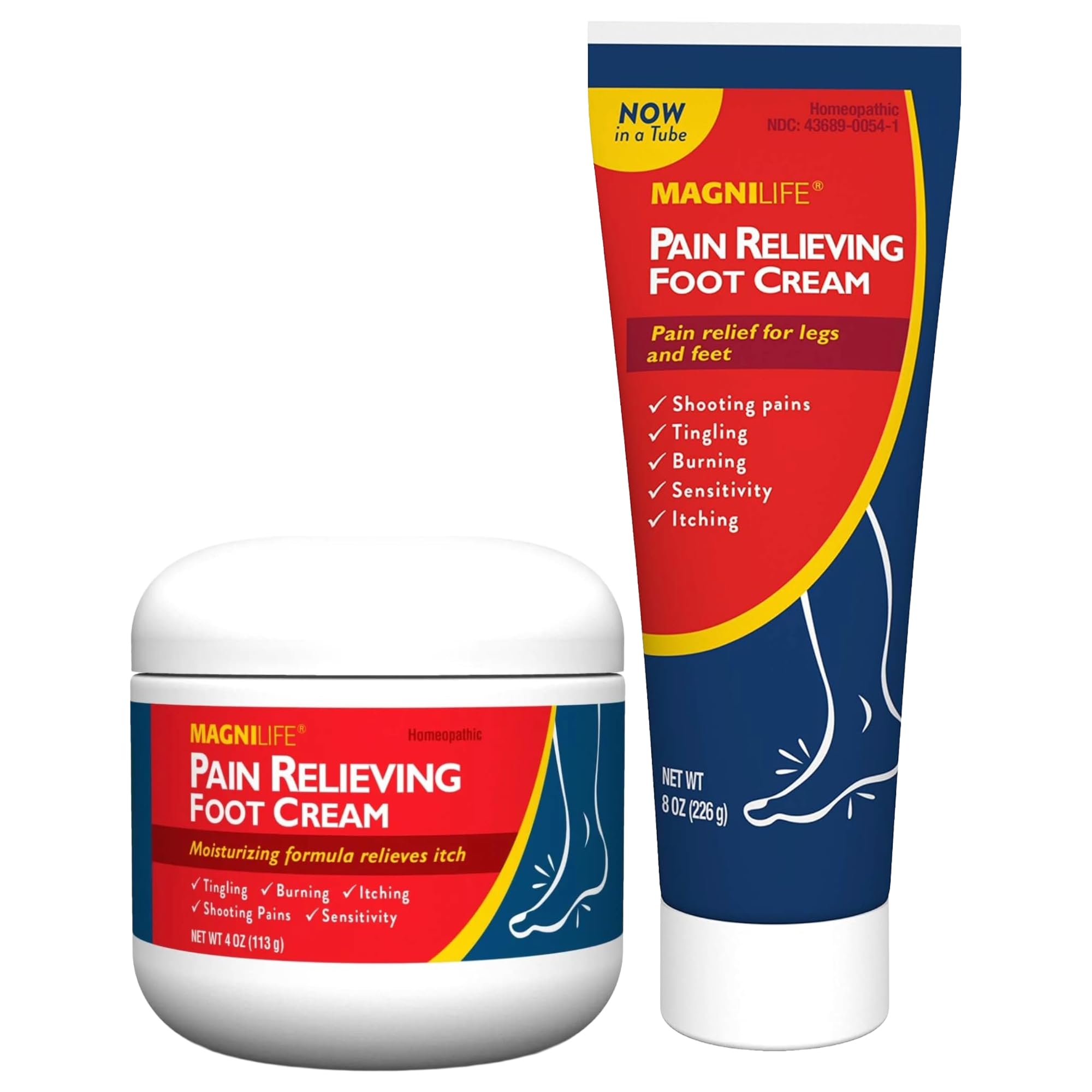 "This MagniLife bundle pairs two sizes of Pain Relieving Foot Cream for targeted relief and moisturization of dry, sensitive feet. Both the 4 oz and 8 oz creams help calm shooting, stabbing, burning, tingling, itching, or sensitivity in feet and legs, providing comfort that allows you to stay active and manage daily discomfort. The moisturizing formulas hydrate severely dry, cracked, and itchy skin while softening calluses and eliminating cracks and fissures. Both creams absorb quickly and are non-greasy, containing beeswax and eucalyptus to leave feet smooth and soft. They are formulated without mineral oils, petroleum, fragrance, or dyes and are safe for individuals with diabetes. In addition to feet, they can be applied to legs and hands to support overall skin comfort and relief. This bundle offers a convenient solution for long-lasting foot care, helping you walk comfortably and maintain healthy, hydrated feet every day."