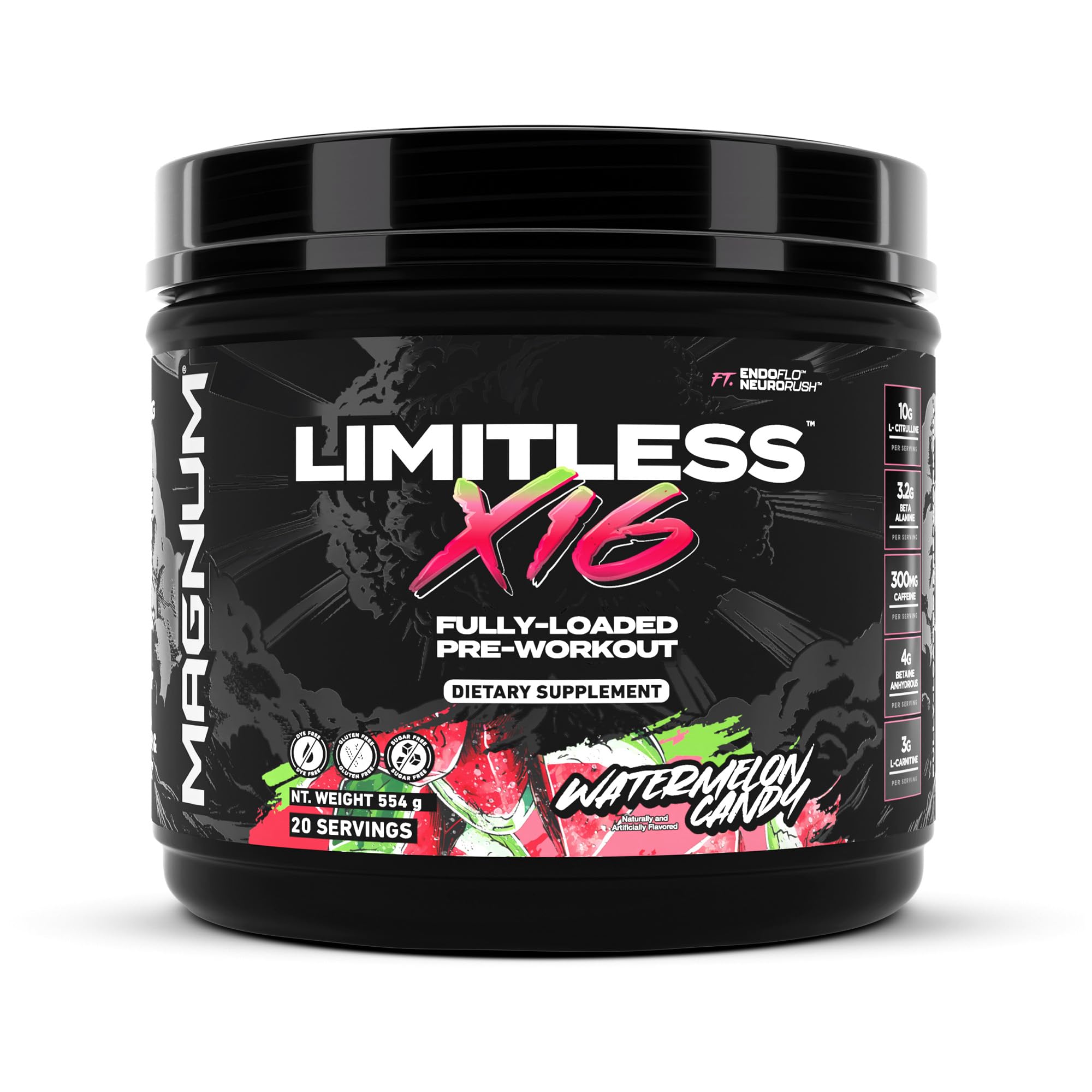 Magnum Nutraceuticals Limitless x16 Fully Loaded Preworkout 20/40 Servings, Watermelon Candy Flavor, High-Energy, Focus, Strength & Endurance for Maximum Performance