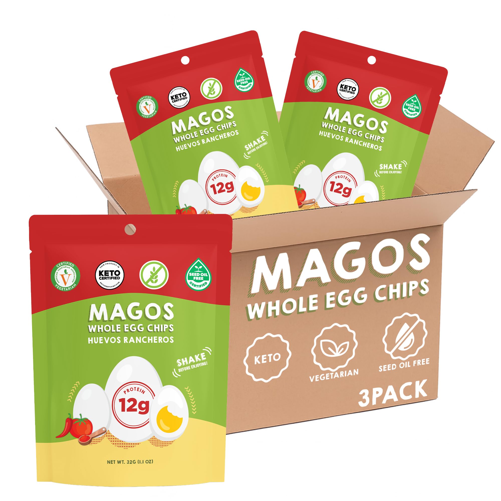Magos Egg Chips Huevos Rancheros, Healthy Snack, High Protein Low Carb, Light Cracker-Style Crunch, 1.1 oz Bags Keto, Vegetarian & Carnivore Friendly, No Gluten Ingredients (3-Pack)