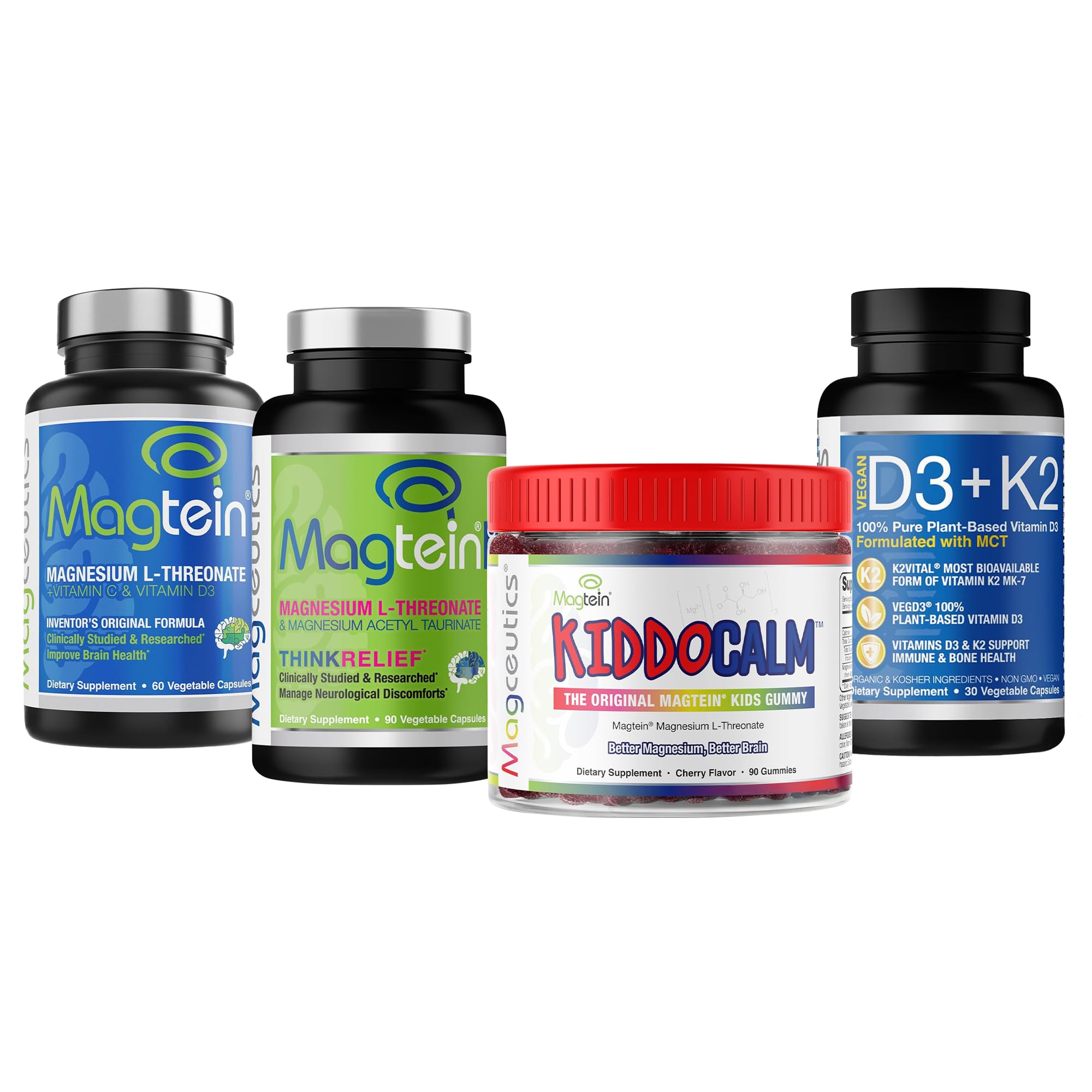 Magtein Magnesium L-Threonate 60 Capsules, Magceutics MagteinPRO 90 Capsules, KIDDOCALM Gummies 90 Capsules, Vitamin D3 K2 30 Capsules - Bundle