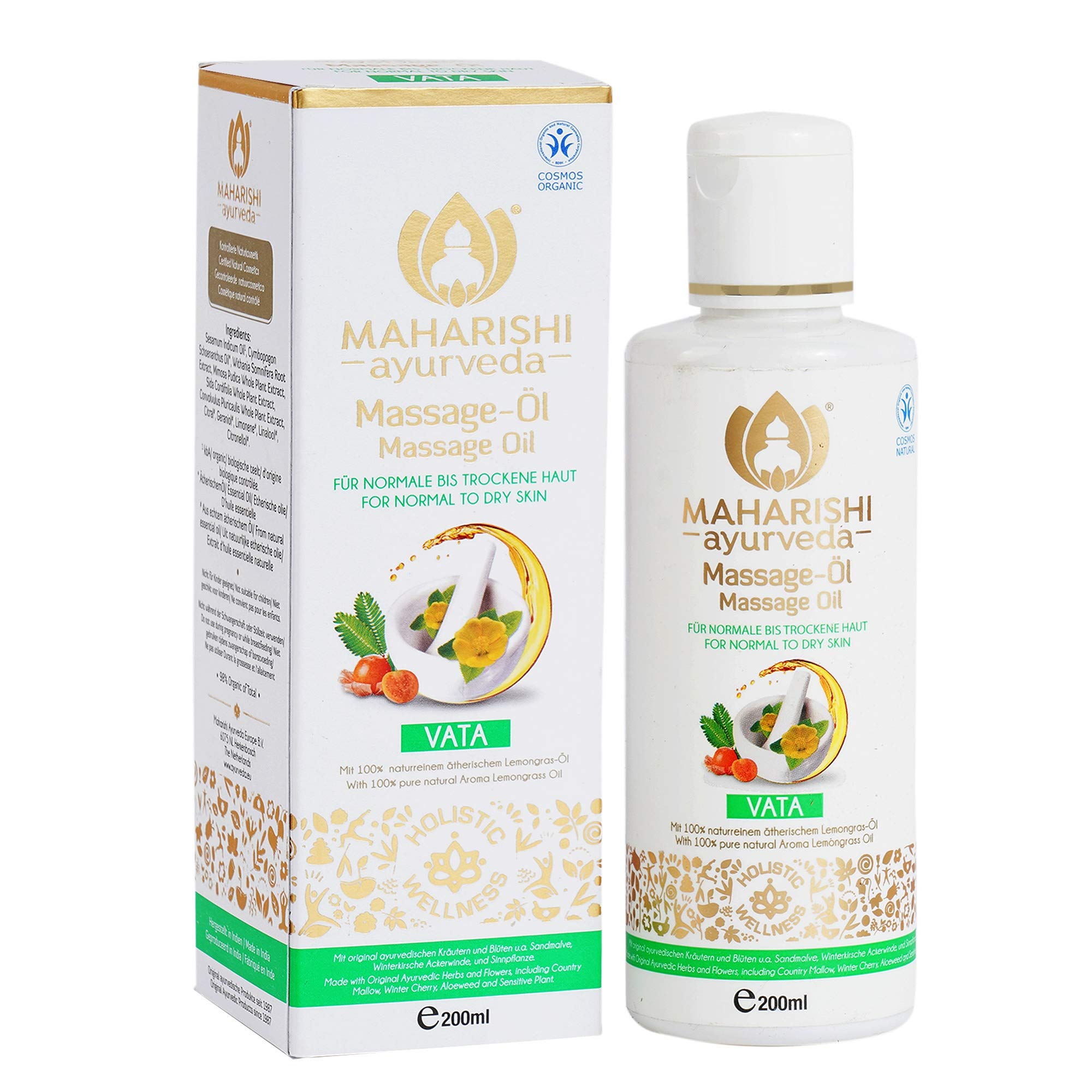 Noble massage oil for normal to dry and combination skin.With original Ayurvedic herbs and flowers, including a.Sandmalve, winter cherry, arable winds and senses.Controlled natural cosmetics, with BDIH Cosmos Organic - certified. Ingredients ingredients Sesamum Indicum Seed Oil, Cymbopogon Schoenanthus Oil, Withania Somnifera Root Extract, Mimosa Pudica Extract, Sida Cordifolia Extract, Convolvulus Pluricaulis Extract, Citral, Geraniol, Limonene, Linalool, Citronellol.also recommended when it is inclined to roughness and feelings of tension - as well as to the calming foot massage before going to bed.In this way, the morning full body massage becomes an experience for skin and senses.100 natural lemongrass aroma oil exudes a summer fragrance.Mature sesame oil from controlled organic cultivation ensures a pleasant skin feeling.Mature sesame oil from controlled organic cultivation ensures a pleasant skin feeling.Edles Massageöl für normale bis trockene und Mischhaut. Mit original ayurvedischen Kräutern und Blüten, u. a. Sandmalve, Winterkirsche, Ackerwinde und Sinnpflanze. Kontrollierte Naturkosmetik, mit BDIH Cosmos Organic - zertifiziert. INHALTSSTOFFE ZUTATEN Sesamum indicum seed oil, Cymbopogon schoenanthus oil, Withania somnifera root extract, Mimosa pudica extract, Sida cordifolia extract, Convolvulus pluricaulis extract, Citral, Geraniol, Limonene, Linalool, Citronellol.Auch bei Neigung zu Rauigkeit und Spannungsgefühlen zu empfehlen – sowie zur beruhigenden Fußmassage vor dem Schlafengehen. So wird die morgendliche Ganzkörpermassage zu einem Erlebnis für Haut und Sinne. 100 natürliches Lemongras-Aromaöl versprüht einen sommerlichen Duft. Gereiftes Sesamöl aus kontrolliert biologischem Anbau sorgt für ein angenehmes Hautgefühl. Gereiftes Sesamöl aus kontrolliert biologischem Anbau sorgt für ein angenehmes Hautgefühl.Maharishi Ayurveda Vata Massageöl für empfindliche Hauttypen, kontrollierte Naturkosmetik 100 natürliche 200 ml Ölpackung von 1