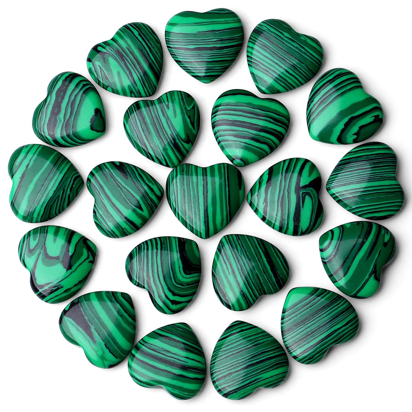 After-sales Service The color and texture of each crystal may be different. After receiving the product, if you have any questions, please contact us in time and we will solve it for you as soon as possible. Crystal gifts for women menCrystals can be given to your friends as Christmas, birthday gifts. Put it as a decoration in your home and office, it can absorb bad energy and bring luck to your friends. Healing crystalCrystals can help us stabilize our emotions and purify our minds. It can reduce bad energy and make us gain luck. It have healing properties. MalachiteMalachite can relieve stress and take us out of negative emotions. It means peace and success. Malachite also has the effect of attracting wealth and is suitable for businessmen to wear to promote career development. Product introductionThe size of this heart-shaped crystal is: 0.8 0.8 0.35inch, 10 pieces in a pack, and the weight is about 0.11lb. It's very cute and portable.