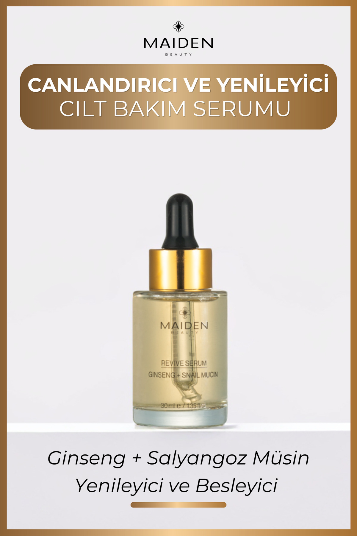 • Maiden Beauty Revive Serum,canliligini kaybetmis ciltler için üretilmistir. Uzun süredir önemli birbitkisel içerik olarak kullanilan 'ginseng' ve cilt elastikiyeti için en iyisinerjiyi yaratan 'salyangoz özü' içerir. Cilde hizla nem saglar ve cildinderinliklerinde uzun süre kalarak saglikli bir cilt olusmasina yardimci olur.