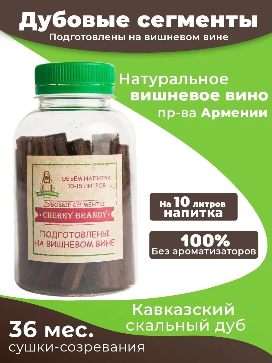 To create a wonderful cherry-flavored moonshine, you'll need "Cherry Brandy" oak sticks, made from Caucasian sessile oak and aged in Armenian cherry wine. The oak sticks will impart a vanilla-chocolate flavor with a distinct cherry aroma. One 60g package is enough to make 10 liters of the drink. The oak segments do not contain artificial flavors. To obtain a drink with more pronounced organoleptic characteristics, increase the aging time from 2 to 4 months!