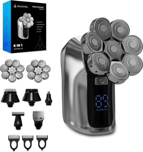 Shave your head and beard in just 120 seconds down to the skin with the Maintro 6-in-1 shaving set! With 8 razors in the shaving head, every surface where hair grows is shaved smoothly. This versatile kit features 6 attachments that allow you to easily shave your head, beard and body hair. Suitable for all hair types, this set will boost your self-confidence by making you look cared for every day. SAFETY WARNING Be careful of cuts, skin irritation, electric shock or injury during use. Only use the device according to the specified cleaning and maintenance instructions to prevent bacterial growth. Do not use the device near water or while charging.Travel lock and accessories: Safe for travel and complete with lubricating oil, cleaning brush, and handy attachments for every shaving need. Smart LED screen: Accurately indicates remaining battery life and cleaning or charging needs. Waterproof design (IPX6): Suitable for wet and dry use, easy to clean. Long battery life and fast charging: Up to 1.5 hours of use on a full charge via USB. Fast and efficient shave: 8 razors in the 8D shaving head provide an ultra-close shave in just 120 seconds. Multifunctional and complete: Includes 6 attachments for shaving head, beard, body, nose and ears, plus exfoliant and massage functions.Maintro Skull scheerapparaat zwart Scheer je hoofd en baard in slechts 120 seconden kaal tot op de huid met de Maintro 6-in-1 scheerset! Met 8 scheermessen in de scheerkop wordt elk oppervlak waar haar groeit glad geschoren. Deze veelzijdige kit is voorzien van 6 opzetstukken waarmee je eenvoudig je hoofd, baard en lichaamshaar kunt scheren. Geschikt voor alle haartypes, deze set geeft je zelfvertrouwen een boost door elke dag verzorgd voor de dag te komen. VEILIGHEIDSWAARSCHUWING Let op voor snijwonden, huidirritaties, elektrische schokken of letsel tijdens het gebruik. Gebruik het apparaat alleen volgens de aangegeven reinigings- en onderhoudsinstructies om bacteriële groei te voorkomen. Gebruik het apparaat niet in de buurt van water of tijdens het opladen.Reisvergrendeling en accessoires: Veilig voor op reis en compleet met smeerolie, schoonmaakborsteltje, en handige opzetstukken voor elke scheerbehoefte. Slim LED-scherm: Geeft nauwkeurig de resterende batterijduur en reinigings- of oplaadbehoeften aan. Waterdicht ontwerp (IPX6): Geschikt voor nat en droog gebruik, eenvoudig schoon te maken. Lange batterijduur en snelle oplading: Tot 1,5 uur gebruikstijd na een volledige oplaadbeurt via USB. Snel en efficiënt scheren: 8 scheermessen in de 8D-scheerkop zorgen voor een ultra gladde scheerbeurt in slechts 120 seconden. Multifunctioneel en compleet: Inclusief 6 opzetstukken voor scheren van hoofd, baard, lichaam, neus en oren, plus exfoliant en massage functies.