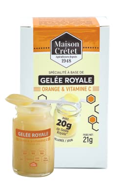 Royal Jelly and Vitamin C We started with the observation that the taste of Royal Jelly isn't always well-received, especially by children or the elderly, who often need it the most. Its slightly bitter and acidic taste can be unpleasant. Therefore, we developed a specialty for you in our laboratory at our honey farm in Gué d'Alleré, Charente-Maritime. Royal Jelly is already an incredible product, a natural source of nutrients and vitamins. We've combined it with energizing vitamin C and sweet orange essential oil for its delicious fruity flavor. The resulting preparation provides you with a harmonious energy balance. You'll finally be able to discover the pleasure of enjoying your Royal Jelly morning and evening with ease and enjoyment. We're sure you'll love it. We've had children try it, and they adore it! The utmost care is taken in this exclusive creation. Hand-packed under sterile conditions, we guarantee a high-quality product! Like all royal jelly, it must be kept refrigerated. We recommend taking 1 gram per day (measuring spoon provided), preferably in the morning on an empty stomach, allowing it to dissolve under the tongue. INGREDIENTS Royal jelly 96.3 , antioxidant: ascorbic acid 3 (100 vitamin C), sweet orange essential oil 0.5 , sweetener: sucralose 0.2Defrosted product, do not refreeze. Recyclable glass jar, measuring spoon. Royal jelly is often difficult to consume because of its taste our recipe is indulgent with orange and Vitamin C, it's delicious. Royal jelly is often difficult to consume because of its taste, especially for children our recipe is indulgent with orange and Vitamin C, it's delicious.Maison Crétet Gelée Royale Orange et Vitamine C 1 Pot verre de 21g, cuillère et boite protectrice 21gDESCRIPTION DU PRODUIT DESCRIPTION DU PRODUIT Gelée Royale et Vitamine C Nous sommes partis du constat que le goût de la Gelée Royale n'est pas toujours bien apprécié, en particulier des enfants ou des personnes âgées qui en ont pourtant souvent le plus besoin. Un peu âcre et acide, la sensation laissée en bouche peut gêner. Nous avons donc élaboré, pour vous, une spécialité au sein de notre laboratoire de notre miellerie du Gué d'Alleré en Charente-Maritime. La Gelée royale est déjà un produit incroyable, source naturelle de nutriments et de vitamines. Nous y avons associé de la vitamine C, aux vertus énergisantes et de l'huile essentielle d'orange douce pour la gourmandise de son goût fruité. La préparation obtenue vous apporte un équilibre énergétique harmonieux. Vous allez enfin pouvoir découvrir le plaisir de déguster votre Gelée Royale le matin comme le soir avec facilité et plaisir. C'est sûr, vous allez l'adopter. Nous l'avons fait goûter à des enfants qui l'adorent ! Le plus grand soin est apporté à cette création exclusive. Mis en pot à la main et sous matériel stérile, nous vous garantissons dès lors un produit de grande qualité ! Comme toutes les gelées royales, elle est à conserver au réfrigérateur. Nous vous conseillons de prendre 1 gr par jour (cuillère doseuse fournie) de préférence le matin à jeun en laissant fondre sous la langue. INGRÉDIENTS gelée royale 96.3 , antioxydant : acide ascorbique 3 (100 de vitamine C), huile essentielle d'orange douce 0.5 , édulcorant : sucralose 0.2Produit décongelé, ne pas recongeler. Pot verre recyclable, cuillère doseuse. la Gelée royale est souvent difficile à consommer à cause de son goût notre recette est gourmande avec l'orange et la Vitamine C, elle est délicieuse.. la Gelée royale est souvent difficile à consommer à cause de son goût, surtout pour les enfants, notre recette est gourmande avec l'orange et la Vitamine C, elle est délicieuse..