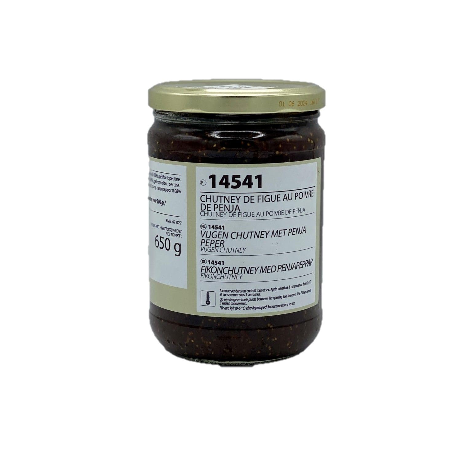 Selected for professionals, this refined fig chutney with Penja pepper will add another dimension to your foie gras, cured meats, and aged cheeses. This chutney contains pieces of fig its typical sweet and tangy flavor will delight your palate. White Penja pepper adds menthol aromas. Entering the Maison des Gourmets (House of Gourmets) means discovering authentic products, born from the finest expertise and the most beautiful terroirs. Refinement, respect for the products and their flavor, precision of technique, and a passion for the craft—that's what the Maison des Gourmets is all about. Ingredients: Fig (60 ), cane sugar, wine vinegar, salt, curry, Penja pepper (0.08 ), gelling agent: pectin. Allergens: None. Storage instructions: Store at room temperature, away from heat and humidity, before opening. Serving suggestion: Serve with cheeses, foie gras, or charcuterie. Product information: - Net weight: 650g - Origin: France Nutritional values per 100g: - Energy: 941kJ 221kcal - Fat: 0.3g, of which saturates 0.1g - Carbohydrate: 52g, of which sugars 50.7g - Protein: 1.1g - Salt: 2g Packaging: Glass jar. Full details are available on the product packaging. The information on this page is for guidance only. We encourage you to read the product label, especially regarding food allergies. SAFETY WARNING Full details are available on the product packaging. The information on this page is for guidance only. We encourage you to read the product label, especially regarding food allergies.Chutney de figue au poivre penja - Maison des Gourmets - pot 650gDESCRIPTION DU PRODUIT DESCRIPTION DU PRODUIT Sélectionné pour des professionnels, ce chutney raffiné de figue au poivre Penja donnera une autre dimension à vos foies gras, charcuteries sèches et fromages secs. Ce chutney contient des morceaux de figue, son goût sucré et vinaigré typique comblera vos papilles. Le poivre Penja blanc apportera des arômes de menthol. Entrer dans la Maison des Gourmets, c'est découvrir des produits authentiques, issus des meilleurs savoirs-faire et des plus beaux terroirs. Finesse, respect des produits et de leur saveur, précision du geste, amour du métier, c'est tout cela la Maison des Gourmets. Ingrédients : Figue (60 ), sucre de canne, vinaigre de vin, sel, curry, poivre de Penja (0.08 ), gélifiant : pectine. Allergènes : Aucun. Mode de conservation : A conserver à température ambiante, à l'abri de la chaleur et de l'humidité avant ouverture. Conseil d'utilisation : En accompagnement des fromages, foies gras ou charcuteries. Informations produit : - Poids net : 650g - Origine : France Valeurs nutritionnelles pour 100g : - Energie : 941kJ 221Kcal - Lipides : 0,3g dont acides gras saturés 0,1g - Glucides : 52g dont sucres 50,7g - Protéines : 1,1g - Sel : 2g Emballage : Pot en verre. Détail complet et disponible sur l'emballage du produit. Les informations présentes sur cette page sont à titre indicatif. Nous vous invitons à prendre connaissance des informations sur l'étiquette du produit, en particulier concernant les allergies alimentaires. AVERTISSEMENT DE SÉCURITÉ Détail complet et disponible sur l'emballage du produit. Les informations présentes sur cette page sont à titre indicatif. Nous vous invitons à prendre connaissance des informations sur l'étiquette du produit, en particulier concernant les allergies alimentaires.