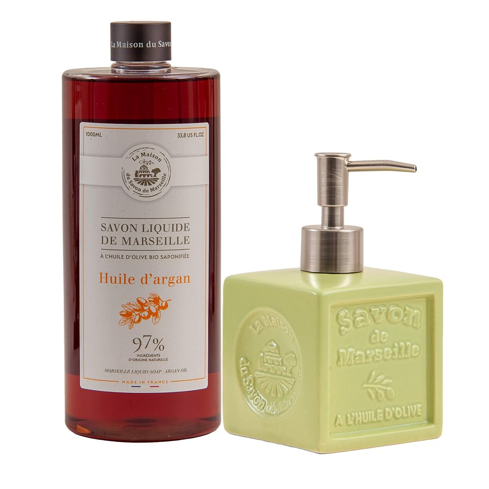 Brand French liquid soap made in the heart of Provence by Maison du Savon. They are known worldwide for delivering great scents with every wash, while providing essential antioxidants to keep your skin clean and healthy. Product Each wash leaves your hands with a delicate scent of argan oil. A scent of orange and lemon, accompanied by a note of lavender, coriander and patchouli in the heart on a vanilla and musky base. Argan oil is rich in vital antioxidants, including vitamin E, to make your skin smooth and supple. This soap is saponified with organic olive oil that is rich in vital antioxidants, including omega 9, which stimulates cell activity and prevents skin aging. This makes olive soap ideal for washing hands and protecting the skin. Comes with a stylish ceramic soap dispenser that holds 300ml of liquid soap. Ceramics work well in a modern or vintage bathroom or kitchen theme. Additionally, the ceramic and cube design make the dispenser compact and less likely to slide around your sink or countertop compared to other materials thanks to the non-slip base. The green olive color looks great in a modern bathroom, especially with the aluminum pump head. This ceramic soap dispenser is suitable for bright colorful themes in your bathroom or kitchen and compliments colors such as red and cream.✓ Green soap dispenser - The green olive color looks great in a modern bathroom, especially with the aluminum pump head. This ceramic soap dispenser is suitable for colorful themes in your bathroom or kitchen and matches colors such as red and cream. ✓ Savon de Marseille Soap - French liquid soap made in the heart of Provence by Maison du Savon. They are known worldwide for delivering great scents with every wash, while providing vital antioxidants to keep your skin clean and healthy. ✓ 300ml Ceramic Soap Dispenser - Ceramic works well in a modern or vintage bathroom or kitchen theme. Additionally, the ceramic and cube design makes the dispenser compact and less likely to slip around your sink or worktop compared to other materials thanks to the non-slip base. ✓ Olive Oil Soap - This soap is saponified with organic olive oil that is rich in vital antioxidants, including omega 9, which stimulates cell activity and prevents skin aging. This makes olive soap ideal for washing hands and protecting the skin. ✓ Argan oil soap - Every wash leaves your hands with a delicate scent of argan oil. A scent of orange and lemon, accompanied by a note of lavender, coriander and patchouli in the heart on a vanilla and musky base. Argan oil is rich in vital antioxidants, including vitamin E, to make your skin smooth and supple.Maison Du Savon De Marseille - Arganolie vloeibare zeep met groene keramische zeepdispenser - 1 liter navulling en 300 milliliter dispenser Merk Franse vloeibare zeep gemaakt in het hart van de Provence door Maison du Savon. Ze staan wereldwijd bekend om het leveren van geweldige geuren bij elke wasbeurt, terwijl ze essentiële antioxidanten bieden om je huid schoon en gezond te houden. Product Elke wasbeurt laat je handen achter met een delicate geur van arganolie. Een geur van sinaasappel en citroen, vergezeld van een noot van lavendel, koriander en patchouli in het hart op een vanille- en muskusachtige basis. Arganolie is rijk aan vitale antioxidanten, waaronder vitamine E, om je huid glad en soepel te maken. Deze zeep is verzeept met biologische olijfolie die rijk is aan vitale antioxidanten, waaronder omega 9, die de celactiviteit stimuleert en veroudering van de huid voorkomt. Dit maakt olijfzeep ideaal voor het wassen van de handen en het beschermen van de huid. Wordt geleverd met een stijlvolle keramische zeepdispenser die 300 ml vloeibare zeep bevat. Keramiek werkt goed in een moderne of vintage badkamer of keukenthema. Bovendien maken het keramische en kubusontwerp de dispenser compact en schuift minder snel rond uw gootsteen of werkblad in vergelijking met andere materialen dankzij de antislipbasis. De groen olijfkleur ziet er geweldig uit in een moderne badkamer, vooral met de aluminium pompkop. Deze keramische zeepdispenser is geschikt voor heldere kleurrijke thema's in je badkamer of keuken en complimenteert kleuren zoals rood en crème.✓ Groene zeepdispenser - De groen olijfkleur ziet er vooral met de aluminium pompkop geweldig uit in een moderne badkamer. Deze keramische zeepdispenser is geschikt voor kleurrijke thema's in je badkamer of keuken en past bij kleuren zoals rood en crème. ✓ Savon de Marseille Soap - Franse vloeibare zeep gemaakt in het hart van de Provence door Maison du Savon. Ze staan wereldwijd bekend om het leveren van geweldige geuren bij elke wasbeurt, terwijl ze vitale antioxidanten leveren om je huid schoon en gezond te houden. ✓ Keramische zeepdispenser van 300 ml - keramiek werkt goed in een moderne of vintage badkamer of keukenthema. Bovendien maakt het keramische en kubusontwerp de dispenser compact en glijdt minder snel rond uw gootsteen of werkblad in vergelijking met andere materialen dankzij de antislipbasis. ✓ Olijfoliezeep - Deze zeep is verzeept met biologische olijfolie die rijk is aan vitale antioxidanten, waaronder omega 9, die de celactiviteit stimuleert en veroudering van de huid voorkomt. Dit maakt olijfzeep ideaal voor het wassen van handen en het beschermen van de huid. ✓ Arganoliezeep - Elke wasbeurt laat je handen achter met een delicate geur van arganolie. Een geur van sinaasappel en citroen, vergezeld van een noot van lavendel, koriander en patchouli in het hart op een vanille en muskusachtige basis. Arganolie is rijk aan vitale antioxidanten, waaronder vitamine E, om je huid glad en soepel te maken.