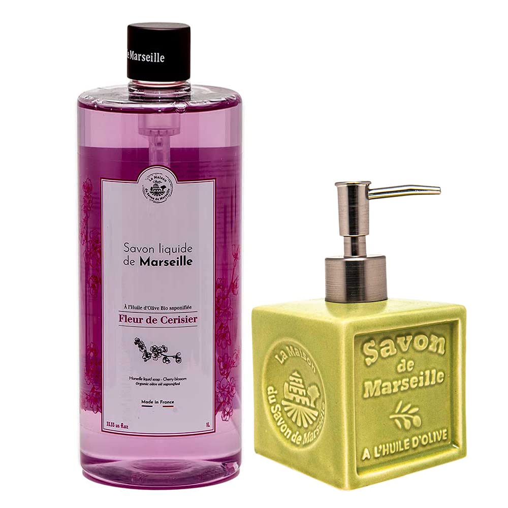 Maison Du Savon De Marseille Cherry blossom liquid soap with green ceramic soap dispenser 1 liter refill and 300 milliliter dispenser