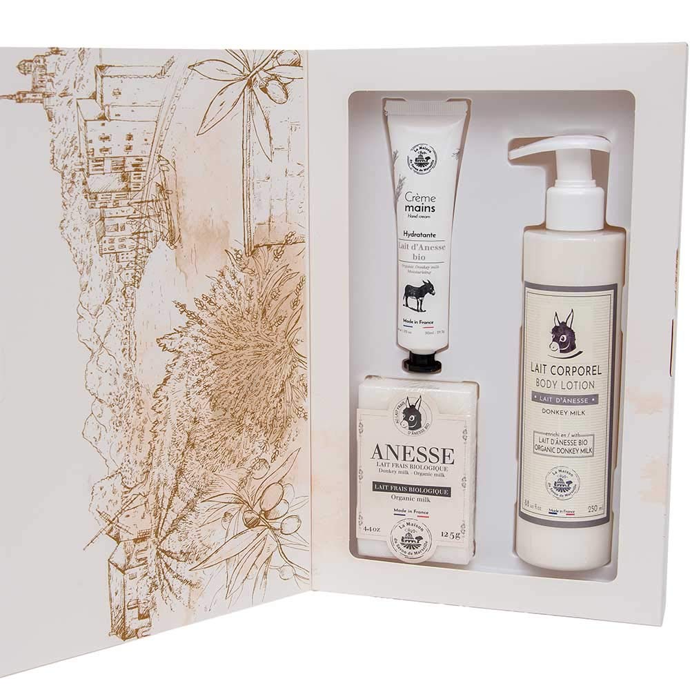 BrandThese skin care products are made in France, by Maison du Savon in the heart of Provence. They are known worldwide for delivering great fragrances while keeping your body clean and your skin healthy.Gift SetContains 1 x 125g donkey milk soap, 1 x 1 Fl Oz donkey milk hand cream, 1 x 8.8 Fl Oz donkey milk body lotion. Perfect body set to wash and moisturise hands and body. All items are organic from the heart of Provence.All products in this set are suitable for all skin types and are enriched with fresh organic donkey milk which helps regenerate damaged skin and is anti-ageing for the skin. Donkey milk contains vital nutrients and antioxidants including vitamins A, B, C and D.Each cosmetic leaves carries a delicate scent of donkey milk which is sweet and musky fragrance with powdery notes at the top and flowery notes at the heart. The fragrance comes from the city of Grasse.This set makes a perfect gift for men or women. The invigorating donkey milk aroma is certain to create a sense of physical and mental well being. Have a relaxing wash in the bath or shower and enjoy the benefits of donkey milk for the mind and skin.
