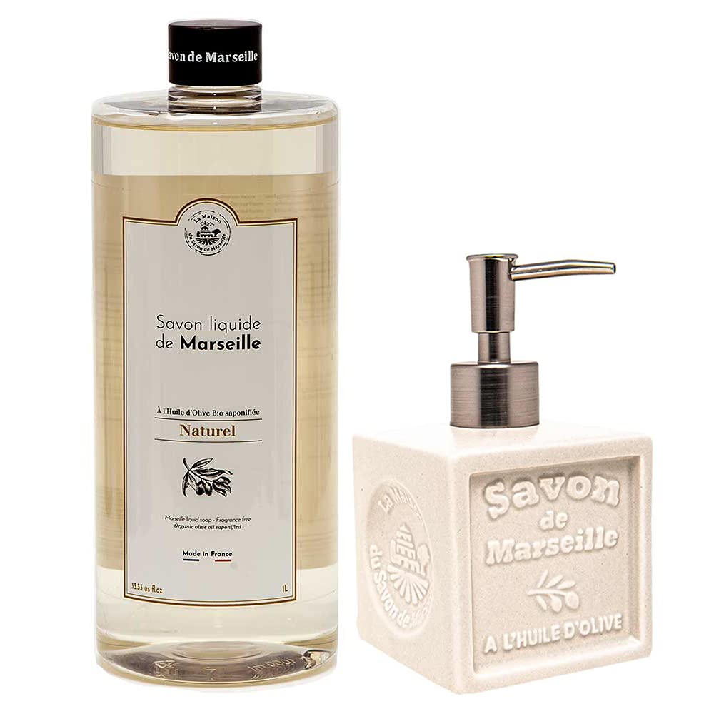 Brand: French liquid soap, made in the heart of Provence by Maison du Savon. They are known worldwide for nice scents with every wash while providing important antioxidants to keep your skin clean and healthy. Product: Made with only 10 ingredients. This liquid soap comes from organic cultivation, is environmentally friendly and free of parabens and synthetic surfactants. This soap is saponified with organic olive oil, which is rich in vital antioxidants, including Omega 9, which stimulates cella activity and prevents skin aging. This makes olive soap ideal for washing hands and protecting the skin. Comes with a stylish ceramic soap dispenser that can hold 300ml of liquid soap. Ceramics work well in a modern or vintage bath or kitchen theme. Additionally, the ceramic and cube design makes the dispenser compact and less likely to slide around your sink or countertop compared to other materials due to the non-slip base. This liquid soap is made with organic essential oils such as olive oil and coconut oil to care for and protect the skin. The liquid soap is manufactured with a sustainable development approach. The color white ivory especially fits in a modern bathroom with the aluminum pump head. This white ceramic soap dispenser is suitable for minimalist color themes in your bathroom or kitchen.✓ Savon de Marseille soap – French liquid soap, made in the heart of Provence from Maison du Savon. They are known worldwide for nice scents with every wash while providing important antioxidants to keep your skin clean and healthy. ✓ White soap dispenser: the white ivory color looks great in a modern bathroom, especially with the aluminum pump head. This white ceramic soap dispenser is suitable for minimalist color themes in your bathroom or kitchen. ✓ 300ml Ceramic Soap Dispenser – Ceramic works well in a modern or vintage bath or kitchen theme. Additionally, the ceramic and cube design makes the dispenser compact and less likely to slide around your sink or countertop compared to other materials due to the non-slip base. ✓ Olive oil soap – this soap is saponified with organic olive oil, which is rich in vital antioxidants, including Omega 9, which stimulates cellulite activity and prevents skin aging. This makes olive soap ideal for washing hands and protecting the skin. ✓ Natural soap – made from only 10 ingredients. This liquid soap comes from organic cultivation, is environmentally friendly and free of parabens and synthetic surfactants.Maison Du Savon De Marseille vloeibare zeep met zeepdispenser, keramiek, 1 liter navulverpakking, 300 ml Merk: Franse vloeibare zeep, vervaardigd in het hart van de Provence van Maison du Savon. Ze zijn wereldwijd bekend om leuke geuren bij elke wasbeurt en bieden tegelijkertijd belangrijke antioxidanten om je huid schoon en gezond te houden. Product: Gemaakt met slechts 10 ingrediënten. Deze vloeibare zeep is afkomstig van biologische teelt, is milieuvriendelijk en vrij van parabenen en synthetische oppervlakteactieve stoffen. Deze zeep is verzeepd met biologische olijfolie, dat rijk is aan vitale antioxidanten, inclusief Omega 9, dat de cellaactiviteit stimuleert en de veroudering van de huid voorkomt. Daardoor is olijfzeep ideaal voor het handen wassen en ter bescherming van de huid. Wordt geleverd met een stijlvolle keramische zeepdispenser die 300 ml vloeibare zeep kan opnemen. Keramiek werkt goed in een modern of vintage bad- of keukenthema. Bovendien maakt het keramische en kubusdesign de dispenser compact en glijdt hij minder waarschijnlijk dat hij in vergelijking met andere materialen door de antislip bodem om je gootsteen of werkblad glijdt. Deze vloeibare zeep wordt gemaakt met biologische etherische oliën zoals olijfolie en kokosolie om de huid te verzorgen en te beschermen. De vloeibare zeep wordt vervaardigd met een aanpak voor duurzame ontwikkeling. De kleur wit ivoorkleurig past vooral in een moderne badkamer met de aluminium pompkop. Deze witte keramische zeepdispenser is geschikt voor minimalistische kleurthema's in je badkamer of keuken.✓ Savon de Marseille zeep – Franse vloeibare zeep, gemaakt in het hart van de Provence van Maison du Savon. Ze zijn wereldwijd bekend om leuke geuren bij elke wasbeurt en bieden tegelijkertijd belangrijke antioxidanten om je huid schoon en gezond te houden. ✓ Witte zeepdispenser: de kleur wit ivoor ziet er in een moderne badkamer vooral met de aluminium pompkop geweldig uit. Deze witte keramische zeepdispenser is geschikt voor minimalistische kleurthema's in je badkamer of keuken. ✓ 300 ml keramische zeepdispenser – keramiek werkt goed in een modern of vintage bad- of keukenthema. Bovendien maakt het keramische en kubusdesign de dispenser compact en glijdt hij minder waarschijnlijk dat hij in vergelijking met andere materialen door de antislip bodem om je gootsteen of werkblad glijdt. ✓ Olijfolie zeep – deze zeep is verzeepd met biologische olijfolie, dat rijk is aan vitale antioxidanten, inclusief Omega 9, die de cellulactiviteit stimuleert en de veroudering van de huid voorkomt. Daardoor is olijfzeep ideaal voor het handen wassen en ter bescherming van de huid. ✓ Natuurlijke zeep – gemaakt van slechts 10 ingrediënten. Deze vloeibare zeep is afkomstig van biologische teelt, is milieuvriendelijk en vrij van parabenen en synthetische oppervlakteactieve stoffen.