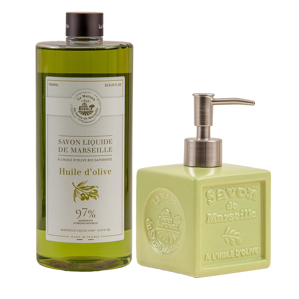 Brand French liquid soap made in the heart of Provence by Maison du Savon. They are known worldwide for delivering great scents with every wash, while providing essential antioxidants to keep your skin clean and healthy. Product Each wash leaves your hands with a delicate scent of olive oil. The olive oil scent contains notes of lime, orange and bergamot resting on a heart of lavender, rosemary and eucalyptus. This soap is saponified with organic olive oil that is rich in vital antioxidants, including omega 9, which stimulates cell activity and prevents skin aging. This makes olive soap ideal for washing hands and protecting the skin. Comes with a stylish ceramic soap dispenser that holds 300ml of liquid soap. Ceramics work well in a modern or vintage bathroom or kitchen theme. Additionally, the ceramic and cube design make the dispenser compact and less likely to slide around your sink or countertop compared to other materials thanks to the non-slip base. This liquid soap is made with organic essential oils including olive oil and coconut oil to nourish and protect the skin. The liquid soap is made with a sustainable development approach. The green olive color looks great in a modern bathroom, especially with the aluminum pump head. This ceramic soap dispenser is suitable for bright colorful themes in your bathroom or kitchen and compliments colors such as red and cream.✓ Green soap dispenser: the green olive color looks great in a modern bathroom, especially with the aluminum pump head. This ceramic soap dispenser is suitable for bright colorful themes in your bathroom or kitchen and compliments colors such as red and cream. ✓ Savon de Marseille Soap - French liquid soap made in the heart of Provence by Maison du Savon. They are known worldwide for delivering great scents with every wash, while providing essential antioxidants to keep your skin clean and healthy. ✓ 300ml Ceramic Soap Dispenser - Ceramic works well in a modern or vintage bathroom or kitchen theme. Additionally, the ceramic and cube design make the dispenser compact and less likely to slide around your sink or countertop compared to other materials thanks to the non-slip base. ✓ Olive Oil Soap - This soap is saponified with organic olive oil that is rich in vital antioxidants, including omega 9, which stimulates cell activity and prevents skin aging. This makes olive soap ideal for washing hands and protecting the skin. ✓ Olive Oil Scented - Every wash leaves your hands with a delicate scent of olive oil. The olive oil scent contains notes of lime, orange and bergamot resting on a heart of lavender, rosemary and eucalyptus.Maison Du Savon De Marseille - Olijfolie vloeibare zeep met groene keramische zeepdispenser - 1 liter navulling en 300 milliliter dispenser Merk Franse vloeibare zeep gemaakt in het hart van de Provence door Maison du Savon. Ze staan wereldwijd bekend om het leveren van geweldige geuren bij elke wasbeurt, terwijl ze essentiële antioxidanten bieden om je huid schoon en gezond te houden. Product Elke wasbeurt laat je handen achter met een delicate geur van olijfolie. De olijfoliegeur bevat tonen van limoen, sinaasappel en bergamot die rust op een hart van lavendel, rozemarijn en eucalyptus. Deze zeep is verzeept met biologische olijfolie die rijk is aan vitale antioxidanten, waaronder omega 9, die de celactiviteit stimuleert en veroudering van de huid voorkomt. Dit maakt olijfzeep ideaal voor het wassen van de handen en het beschermen van de huid. Wordt geleverd met een stijlvolle keramische zeepdispenser die 300 ml vloeibare zeep bevat. Keramiek werkt goed in een moderne of vintage badkamer of keukenthema. Bovendien maken het keramische en kubusontwerp de dispenser compact en schuift minder snel rond uw gootsteen of werkblad in vergelijking met andere materialen dankzij de antislipbasis. Deze vloeibare zeep is gemaakt met biologische etherische oliën waaronder olijfolie en kokosolie om de huid te voeden en te beschermen. De vloeibare zeep is gemaakt met een benadering van duurzame ontwikkeling. De groen olijfkleur ziet er geweldig uit in een moderne badkamer, vooral met de aluminium pompkop. Deze keramische zeepdispenser is geschikt voor heldere kleurrijke thema's in je badkamer of keuken en complimenteert kleuren zoals rood en crème.✓ Groene zeepdispenser: de groen olijfkleur ziet er geweldig uit in een moderne badkamer, vooral met de aluminium pompkop. Deze keramische zeepdispenser is geschikt voor heldere kleurrijke thema's in je badkamer of keuken en complimenteert kleuren zoals rood en crème. ✓ Savon de Marseille Soap - Franse vloeibare zeep gemaakt in het hart van de Provence door Maison du Savon. Ze staan wereldwijd bekend om het leveren van geweldige geuren bij elke wasbeurt, terwijl ze essentiële antioxidanten bieden om je huid schoon en gezond te houden. ✓ Keramische zeepdispenser van 300 ml - Keramiek werkt goed in een modern of vintage badkamer- of keukenthema. Bovendien maken het keramische en kubusontwerp de dispenser compact en schuift minder snel rond uw gootsteen of werkblad in vergelijking met andere materialen dankzij de antislipbasis. ✓ Olijfoliezeep - Deze zeep is verzeept met biologische olijfolie die rijk is aan vitale antioxidanten, waaronder omega 9, die de celactiviteit stimuleert en veroudering van de huid voorkomt. Dit maakt olijfzeep ideaal voor het wassen van de handen en het beschermen van de huid. ✓ Olijfolie Geurend - Elke wasbeurt laat je handen achter met een delicate geur van olijfolie. De olijfoliegeur bevat tonen van limoen, sinaasappel en bergamot die rust op een hart van lavendel, rozemarijn en eucalyptus.