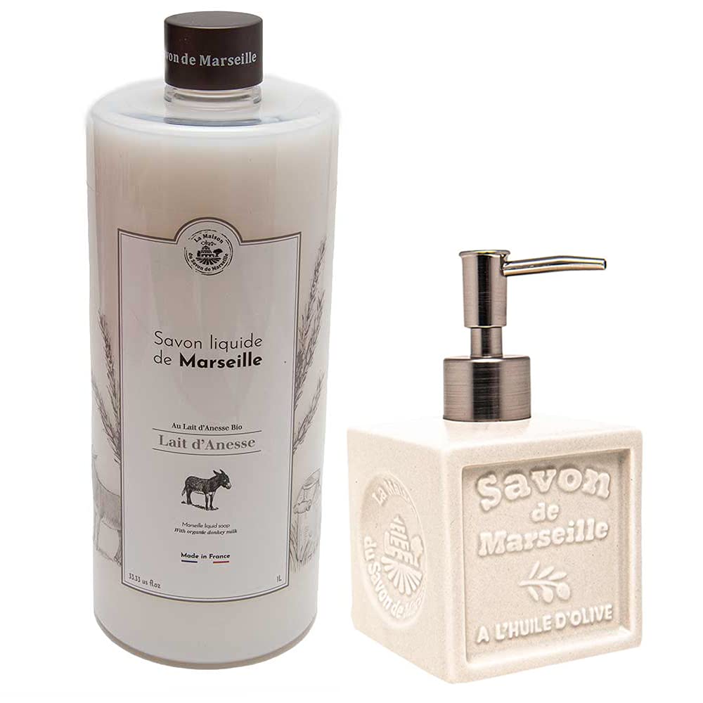 Brand: French liquid soap, made in the heart of Provence by Maison du Savon. They are known worldwide for nice scents with every wash while providing important antioxidants to keep your skin clean and healthy. Product: Each wash leaves your hands with a delicate scent of donkey milk. A subtle, sweet and musky scent with powdery notes at the top and floral notes in the heart. Donkey milk is rich in minerals and fatty acids that protect and repair your skin. This soap is saponified with organic olive oil, which is rich in vital antioxidants, including Omega 9, which stimulates cella activity and prevents skin aging. This makes olive soap ideal for washing hands and protecting the skin. Comes with a stylish ceramic soap dispenser that can hold 300ml of liquid soap. Ceramics work well in a modern or vintage bath or kitchen theme. Additionally, the ceramic and cube design makes the dispenser compact and less likely to slide around your sink or countertop compared to other materials due to the non-slip base. The liquid soap is made with fresh organic donkey milk and essential oils such as olive oil and coconut oil to care for and protect the skin. The liquid soap is manufactured with a sustainable development approach. The color white ivory especially fits in a modern bathroom with the aluminum pump head. This white ceramic soap dispenser is suitable for minimalist color themes in your bathroom or kitchen.✓ White soap dispenser: the white ivory color looks great in a modern bathroom, especially with the aluminum pump head. This white ceramic soap dispenser is suitable for minimalist color themes in your bathroom or kitchen. ✓ Savon de Marseille soap – French liquid soap, made in the heart of Provence from Maison du Savon. They are known worldwide for nice scents with every wash while providing important antioxidants to keep your skin clean and healthy. ✓ 300ml Ceramic Soap Dispenser – Ceramic works well in a modern or vintage bath or kitchen theme. Additionally, the ceramic and cube design makes the dispenser compact and less likely to slide around your sink or countertop compared to other materials due to the non-slip base. ✓ Olive oil soap – this soap is saponified with organic olive oil, which is rich in vital antioxidants, including Omega 9, which stimulates cellulite activity and prevents skin aging. This makes olive soap ideal for washing hands and protecting the skin. ✓ Donkey Milk Soap - Every wash leaves your hands with a delicate scent of donkey milk. A subtle, sweet and musky scent with powdery notes at the top and floral notes in the heart. Donkey milk is rich in minerals and fatty acids that protect and repair your skin.Maison Du Savon De Marseille vloeibare ezelmelk-zeep met witte keramische zeepdispenser, navulverpakking 1 liter en dispenser 300 ml Merk: Franse vloeibare zeep, vervaardigd in het hart van de Provence van Maison du Savon. Ze zijn wereldwijd bekend om leuke geuren bij elke wasbeurt en bieden tegelijkertijd belangrijke antioxidanten om je huid schoon en gezond te houden. Product: Elke wasbeurt laat je handen een delicate geur van ezelmelk achter. Een subtiele, zoete en muskusachtige geur met poederachtige noten boven en bloemige tonen in het hart. Ezelmelk is rijk aan mineralen en vetzuren die je huid beschermen en herstellen. Deze zeep is verzeepd met biologische olijfolie, dat rijk is aan vitale antioxidanten, inclusief Omega 9, dat de cellaactiviteit stimuleert en de veroudering van de huid voorkomt. Daardoor is olijfzeep ideaal voor het handen wassen en ter bescherming van de huid. Wordt geleverd met een stijlvolle keramische zeepdispenser die 300 ml vloeibare zeep kan opnemen. Keramiek werkt goed in een modern of vintage bad- of keukenthema. Bovendien maakt het keramische en kubusdesign de dispenser compact en glijdt hij minder waarschijnlijk dat hij in vergelijking met andere materialen door de antislip bodem om je gootsteen of werkblad glijdt. De vloeibare zeep wordt gemaakt met verse biologische ezelmelk en etherische oliën zoals olijfolie en kokosolie om de huid te verzorgen en te beschermen. De vloeibare zeep wordt vervaardigd met een aanpak voor duurzame ontwikkeling. De kleur wit ivoorkleurig past vooral in een moderne badkamer met de aluminium pompkop. Deze witte keramische zeepdispenser is geschikt voor minimalistische kleurthema's in je badkamer of keuken.✓ Witte zeepdispenser: de kleur wit ivoor ziet er in een moderne badkamer vooral met de aluminium pompkop geweldig uit. Deze witte keramische zeepdispenser is geschikt voor minimalistische kleurthema's in je badkamer of keuken. ✓ Savon de Marseille zeep – Franse vloeibare zeep, gemaakt in het hart van de Provence van Maison du Savon. Ze zijn wereldwijd bekend om leuke geuren bij elke wasbeurt en bieden tegelijkertijd belangrijke antioxidanten om je huid schoon en gezond te houden. ✓ 300 ml keramische zeepdispenser – keramiek werkt goed in een modern of vintage bad- of keukenthema. Bovendien maakt het keramische en kubusdesign de dispenser compact en glijdt hij minder waarschijnlijk dat hij in vergelijking met andere materialen door de antislip bodem om je gootsteen of werkblad glijdt. ✓ Olijfolie zeep – deze zeep is verzeepd met biologische olijfolie, dat rijk is aan vitale antioxidanten, inclusief Omega 9, die de cellulactiviteit stimuleert en de veroudering van de huid voorkomt. Daardoor is olijfzeep ideaal voor het handen wassen en ter bescherming van de huid. ✓ Ezelmelkzeep – elke keer wassen laat je handen met een delicate geur van ezelmelk achter. Een subtiele, zoete en muskusachtige geur met poederachtige noten boven en bloemige tonen in het hart. Ezelmelk is rijk aan mineralen en vetzuren die je huid beschermen en herstellen.
