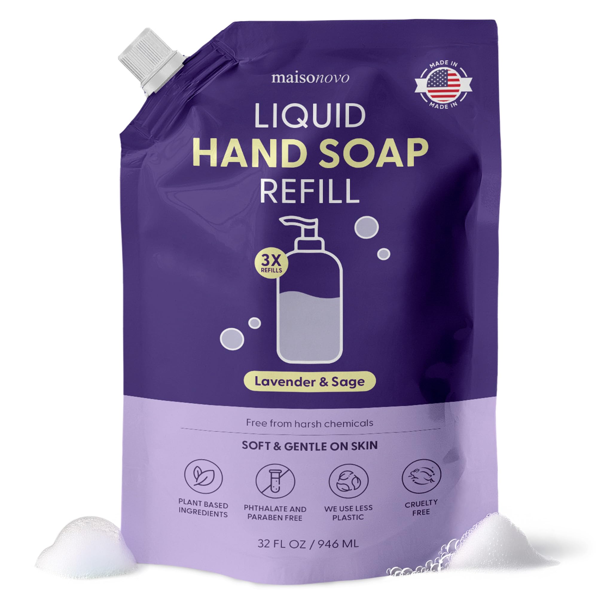 MaisoNovo Hand Soap Refills - Liquid Hand Soap Refill Made in USA - Gentle & Natural - Non Toxic Hand Refill - Good for All Skin Types - Lavender Hand Refill - Pouch 32 oz