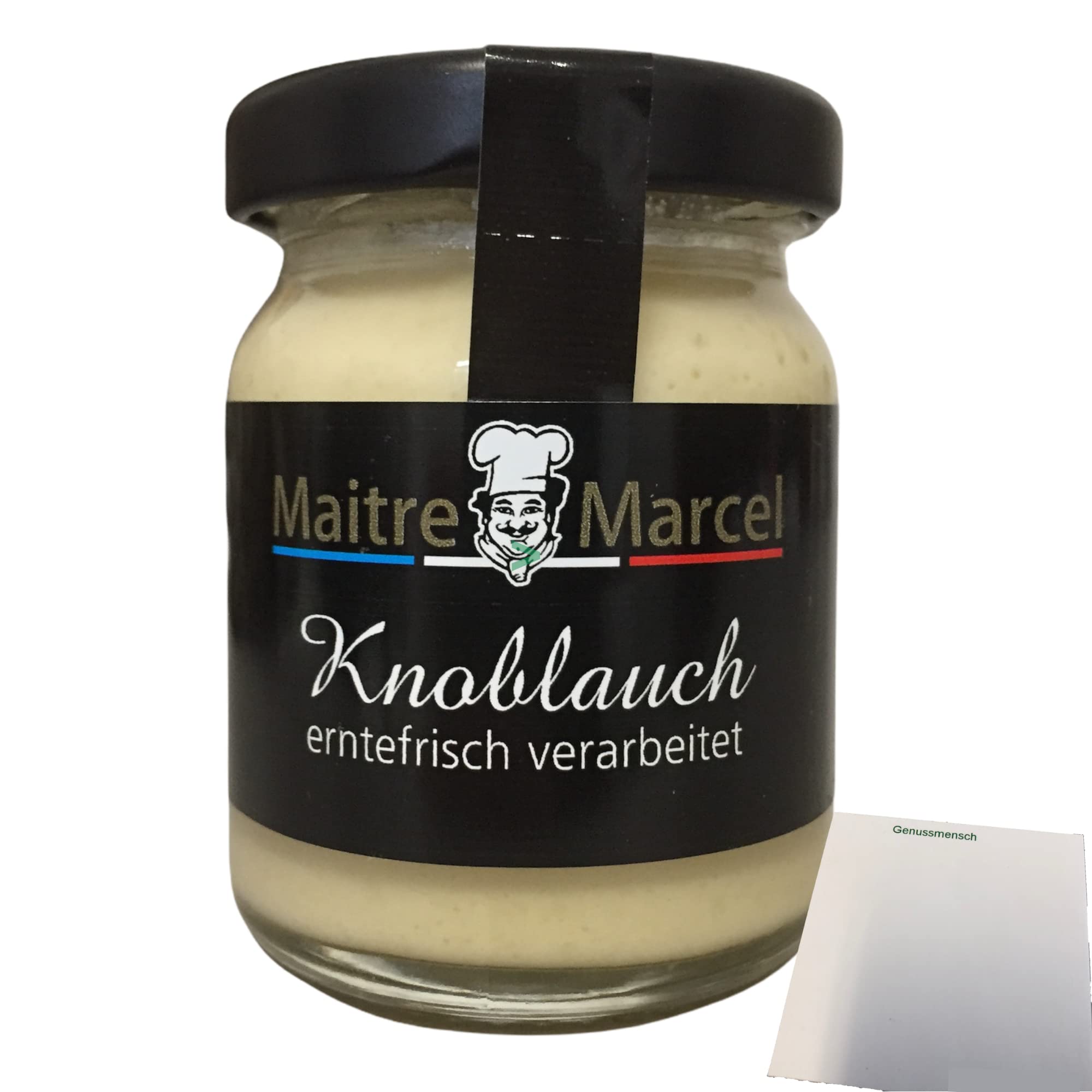 enthält 1x50g Glas + usy Block: Genussmensch. eignet sich besonders für Knoblauchbutter auf knusprigen Baguette. für Saucen und Marinaden. erntefrisch verarbeitet. Maitre Marcel Knoblauch.