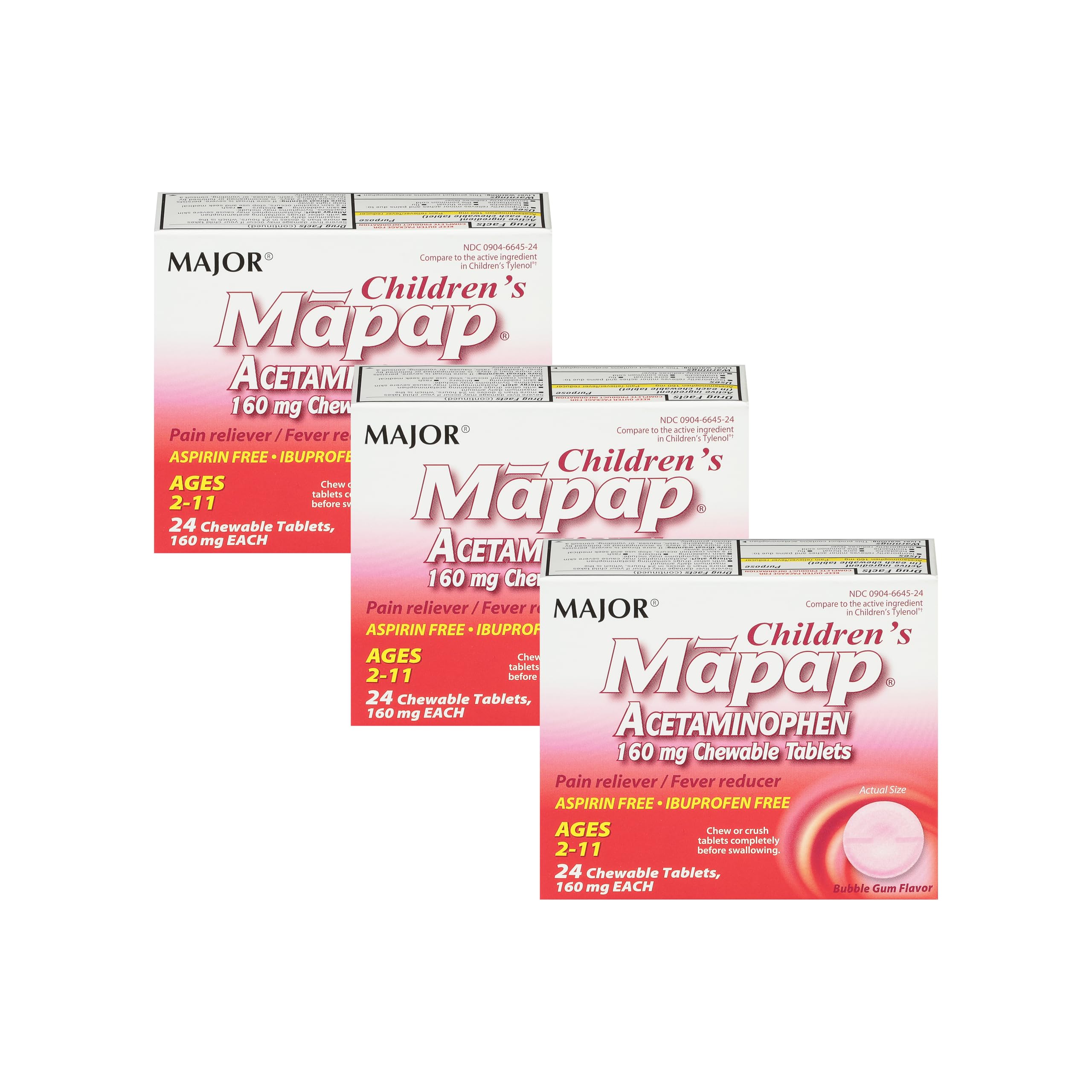 MAJOR Children s Mapap Acetaminophen 160 mg Chewable Tablets - Pain Reliever/Fever Reducer - Aspirin Free - Ibuprofen Free - for Ages 2 to 11-24 Count (3 Pack) 24 Count (Pack of 3)