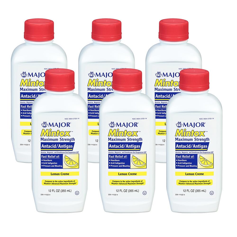 Major Mintox Maximum Strength Antacid/Antigas for Fast Relief of Heartburn Acid Indigestion Pressure Bloating - Lemon Creme - 12 Fl Oz (355 mL) (6 Pack)